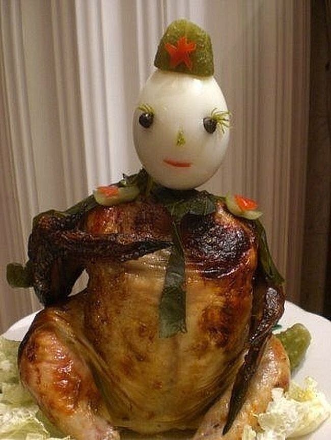 У нас в компании лет 8 назад отдел по хоз.делам на 23 февраля заказали огромный торт в виде танка и танкистов на нем. Типо к праздничному столу .