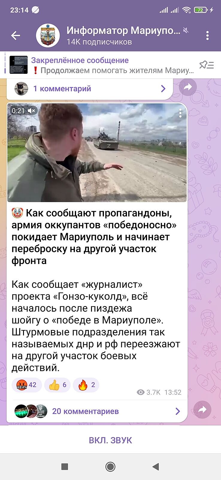Вдень бачила відео,де виїжджають танки .Не факт,що з Маріуполя зйомки і не факт,що це сьогодні знято.Просто дорога ,по якій їдуть танки.