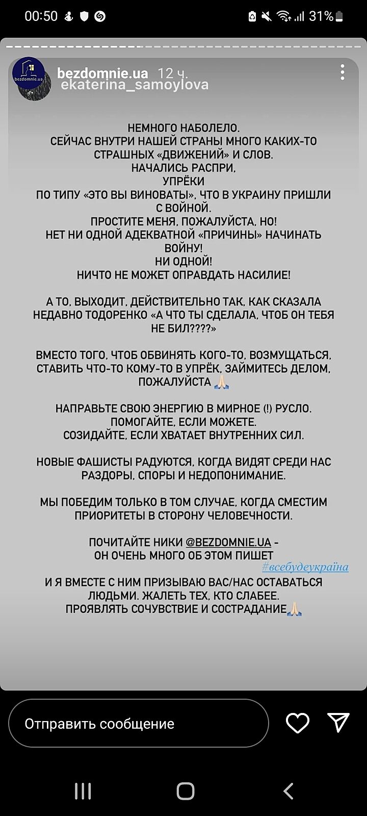 Хто ’ми’??? Перший тиждень війни біля мого міста, та в сусідньому районі такі бої ішли, що все двигтіло і палало. Його ніхто не слухав, молилися, та сиділи по підвалах... Він взагалі хто? У нього зовнішність і манери типового інста-психолога. 🤮🤮🤮