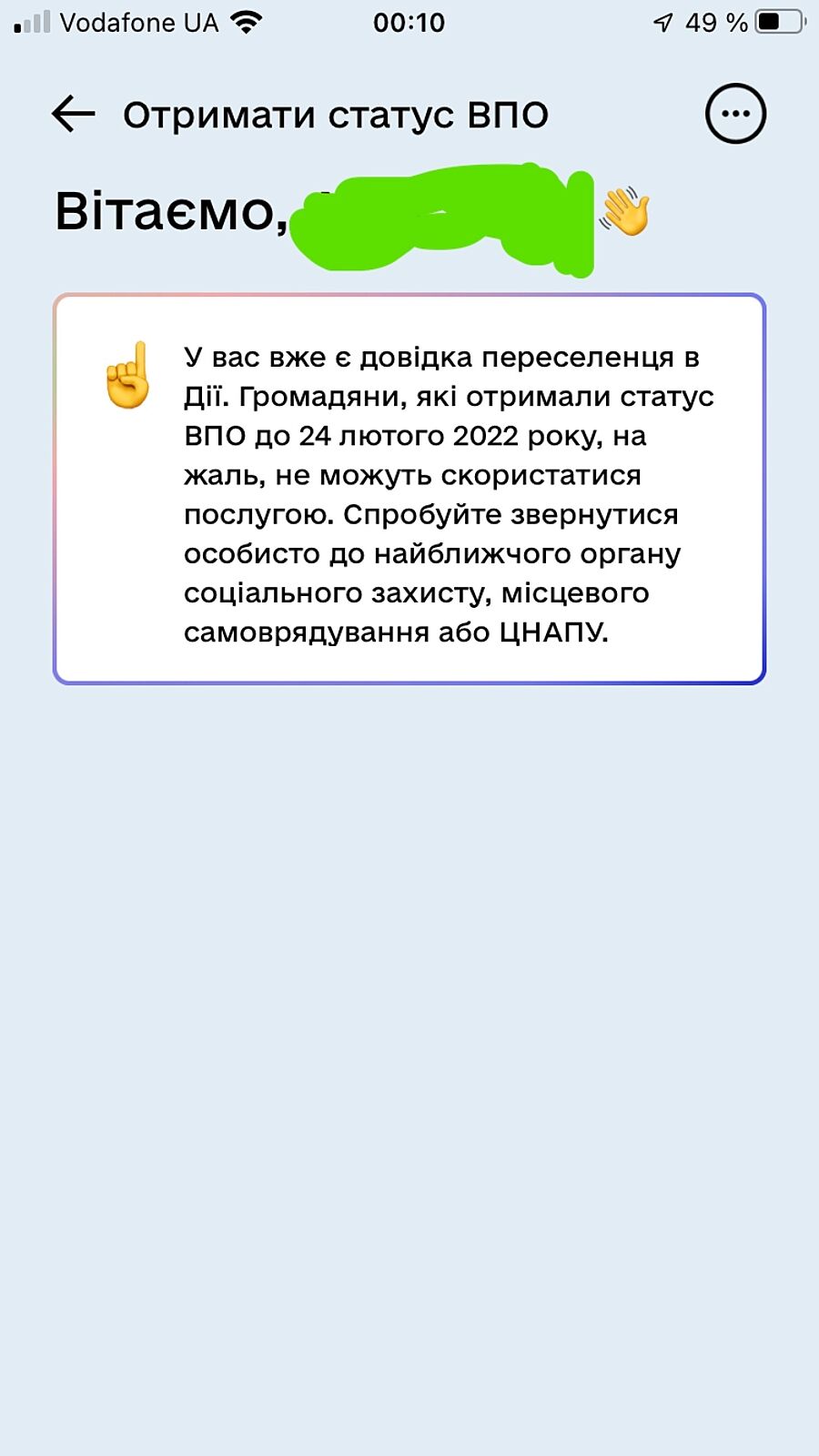 Наразі таке повідомлення відображається у всіх користувачів, які отримали статус ВПО. Якщо ви подавали заяву на отримання статусу ВПО через ЦНАП або УПСЗН, то радимо вам очікувати на її розгляд.