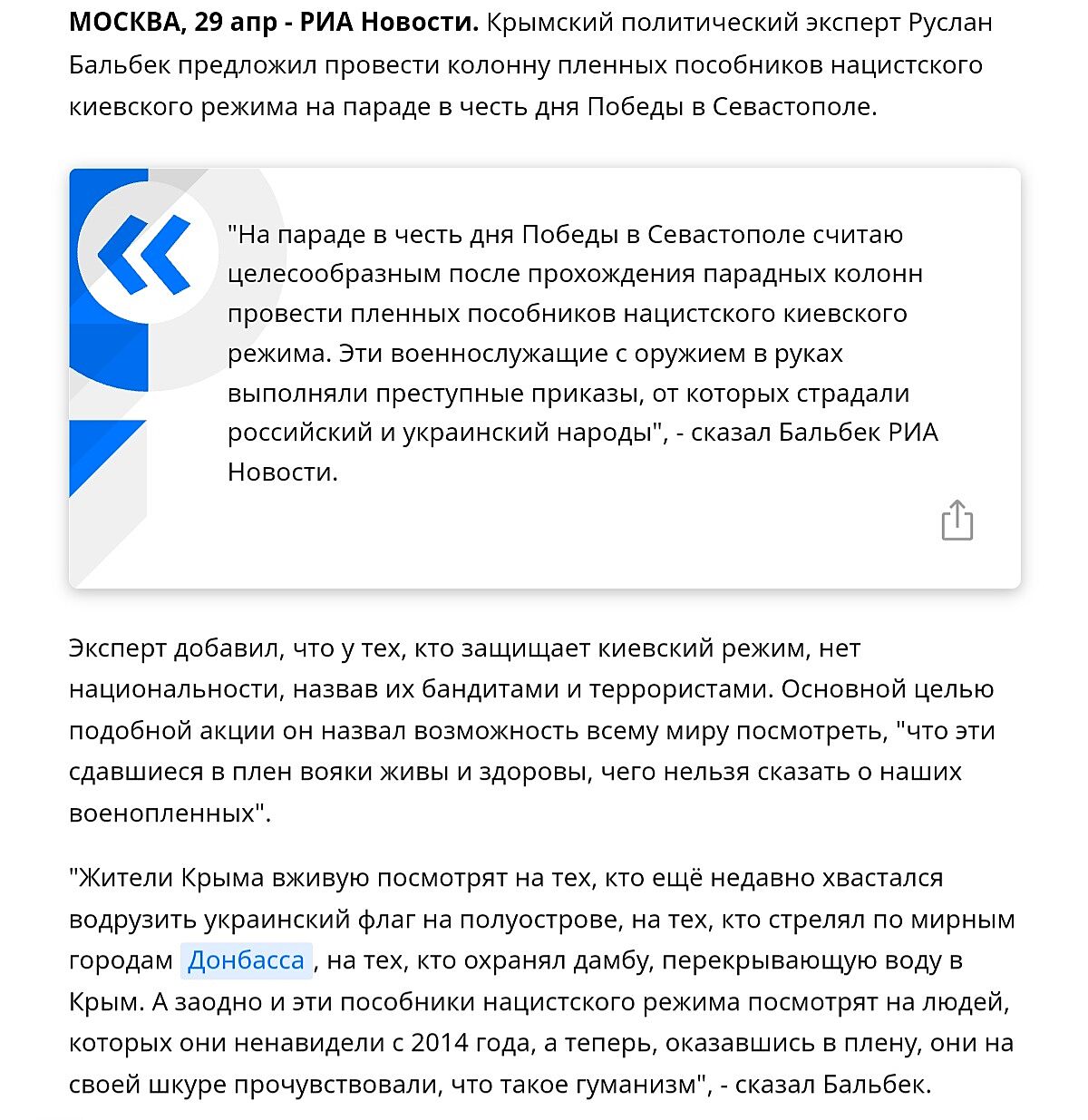 По информации источников, в Кремле рассматривают вопрос об участии в «параде Победы» более 500 украинских военнопленных, которых собираются провести на глазах у шокированной публики и под видеосъёмку с целью демонстрации силы и превосходства армии РФ и для подавления воли/деморализации украинцев. Окончательное решение пока не принято, но реализация этого сценария прорабатывается и до 6 мая будет окончательное решение вопроса. Для выполнения этой задачи оперативники ФСИН и ФСБ ведут оперативную работу с содержащимися в целом ряде учреждений УИС украинцами, которых расселили в разные учреждения ФСИН на расстоянии 100-300км от Москвы в ряде СИЗО и ПФРСИ при колониях.