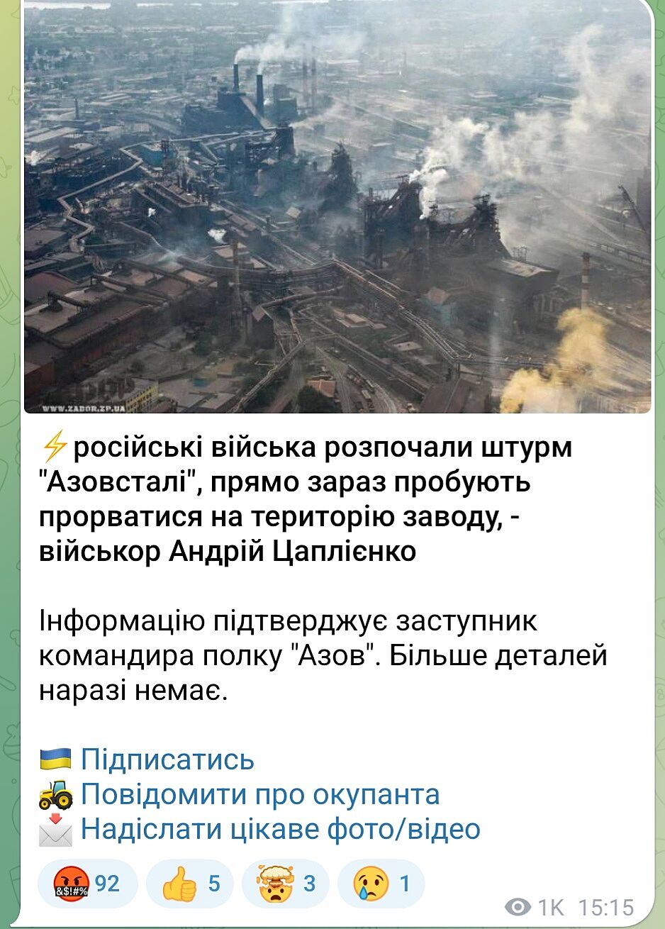 Заступник командира полку “Азов” капітан Святослав “Калина” Паламар повідомляє про те, що росіяни розпочали штурм заводу “Азовсталь” у Маріуполі.