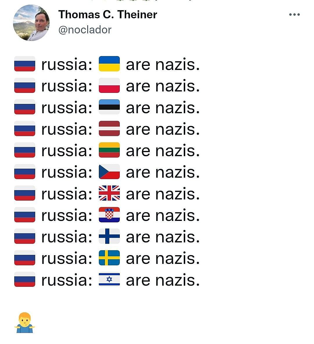 При этом заявляет, что вокруг одни нацисты, у которых куча союзников. Внимание, вопрос: кого победили и как это великая победа, если вокруг все равно полно нацистов?