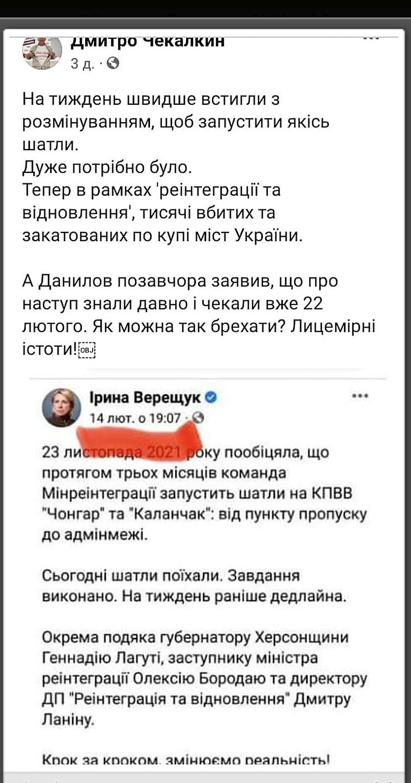 Начальник СБУ херсонской области приказал разминировать пункты пропусков из Крыма за несколько дней до наступления, и вначале войны сбежал. Видно продался предатель