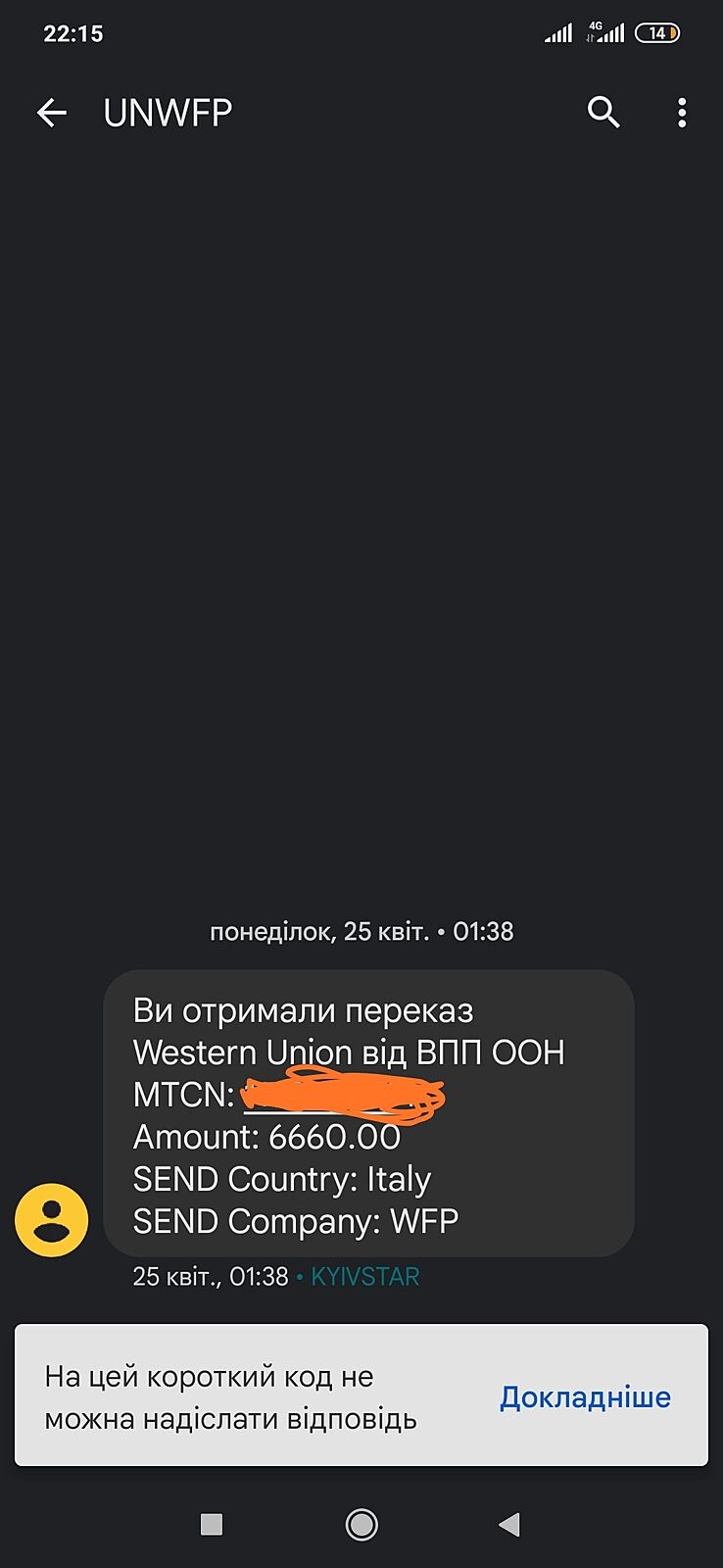 Виплачуємо допомогу від Всесвітня продовольча програма ООН (World Food Programme, WFP) внутрішньопереміщеним особам через Western Union в ПриватБанку.