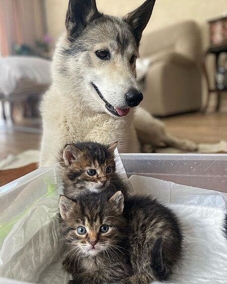 У дочки мужа есть молода кошка. Недавно подобрали собаку (потеряшка) и 4 котят. Двух забрали, а два так у нее и живут.