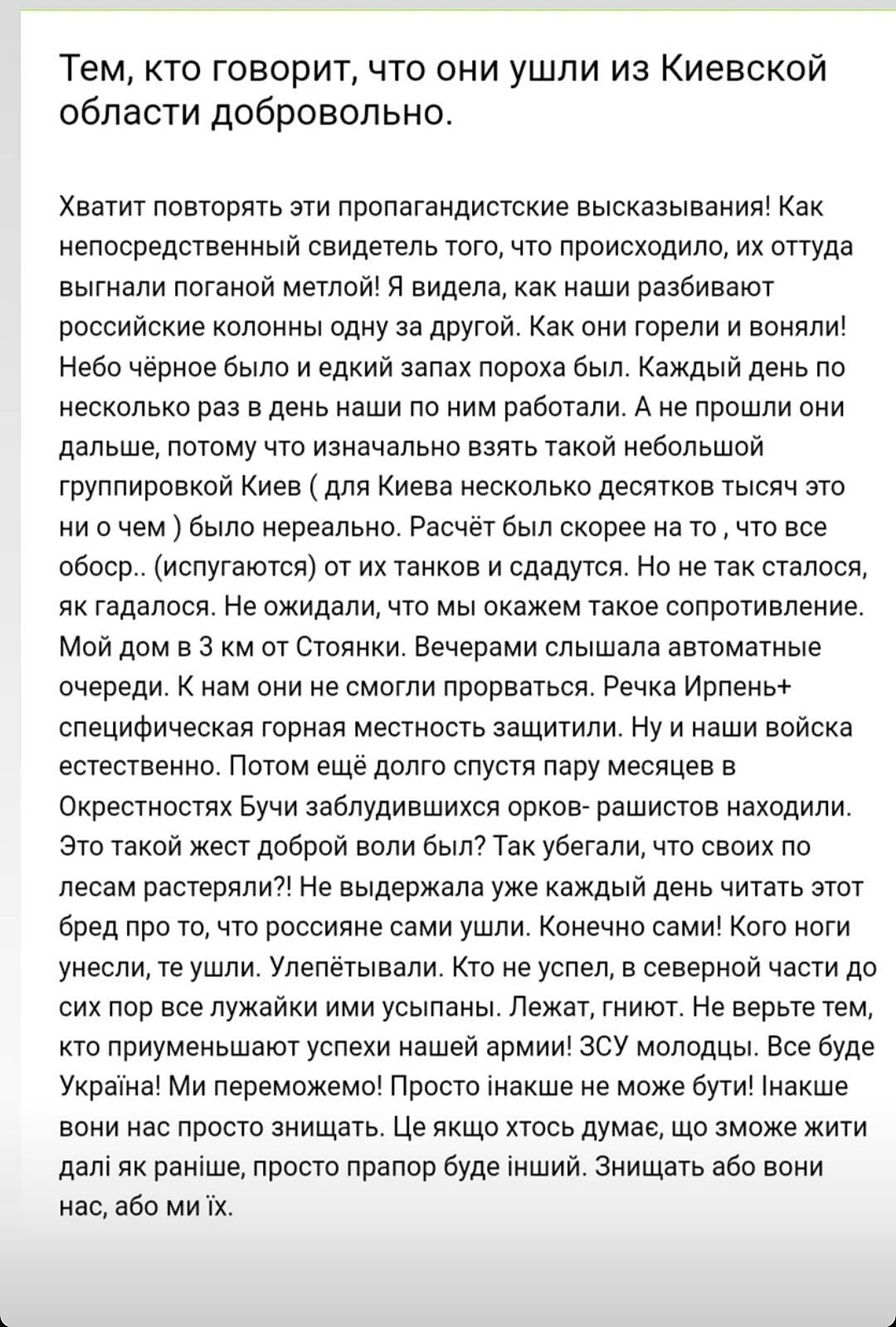 Мне тоже смешно читать, что наши выгнали орков из-под Киева. Так гнали, что те успели фурами награбленное вывезти, ещё и заминировать все. Они абсолютно осознанно отошли сами. Причём неспешно. А нам всем в уши влили, что их прогнали