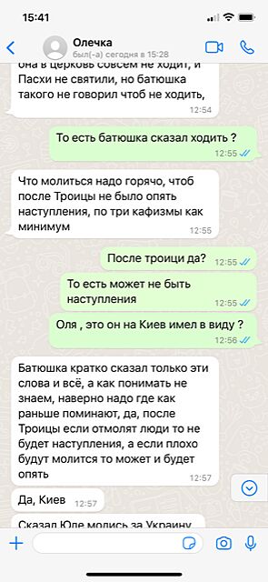 Не подумайте что я сумашедшая. с подругой сегодня переписывалась. у Нас есть архимадрит Ириней который за 3 года при наших визитах к нему предсказывал эту войну в подробностях. Ему 96 лет, плохо видит - сидит в затворе (молнию не читает если что).Хоть в моей жизни все сбылось что он говорил в личном плане, но в войну я как конченный оптимист не верила до 24-го. И вот мне сегодня знакомая пишет. Я у нее спрашивала нет ли сводок от батюшки - он в затворе в монастыре около Даневки Черниговской области и через сторожа, который к нему имеет доступ иногда он передает ответы на вопросы. И вот она мне отвечает. а троица это как раз 20 -е июня. я случайно сюда зашла первый раз за много месяцев - и надо же смотрю - и тут 2- е июня. В общем хорошо нужно всем молится... точно лишним не будет.