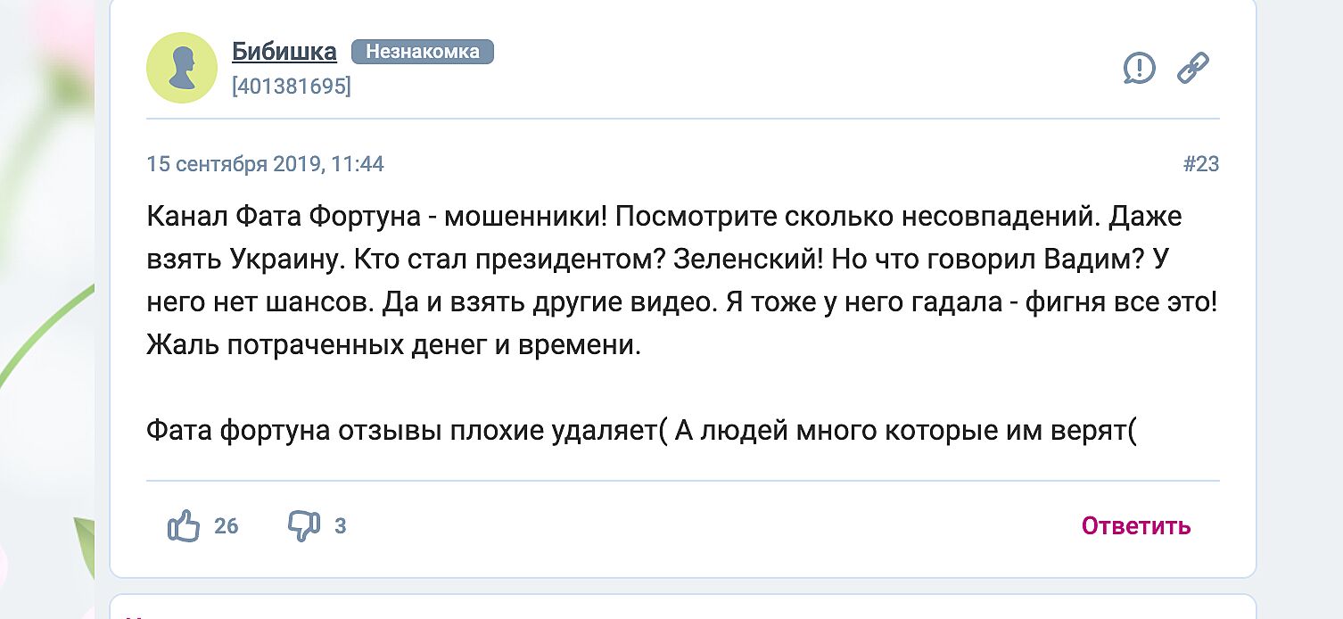 Да ,там много таких отзывов но больше всего запомнилось..как две сестры пошли к нему гадать ..Он нагадал им прекрасную жизнь,удачные браки...А они обе погибли в автокатастрофе(((( и уже их родители написали о нем отзыв и лично ему.. Он ответил им ’бывает не попадает он с прогнозом’