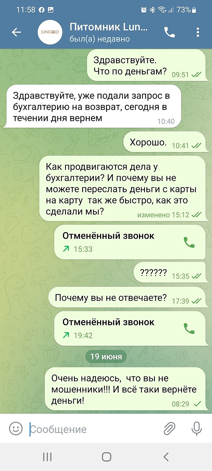Телефон у заводчика скрыт в телеграмм, аргумент, что нет связи, мы созванивались там с людьми которые должны были посмотреть, связь есть.