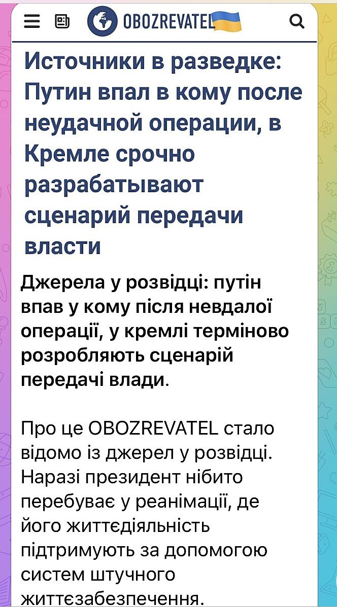 Джерела у розвідці: Путін впав у кому після невдалої операції, у Кремлі терміново розробляють сценарій передачі влади.