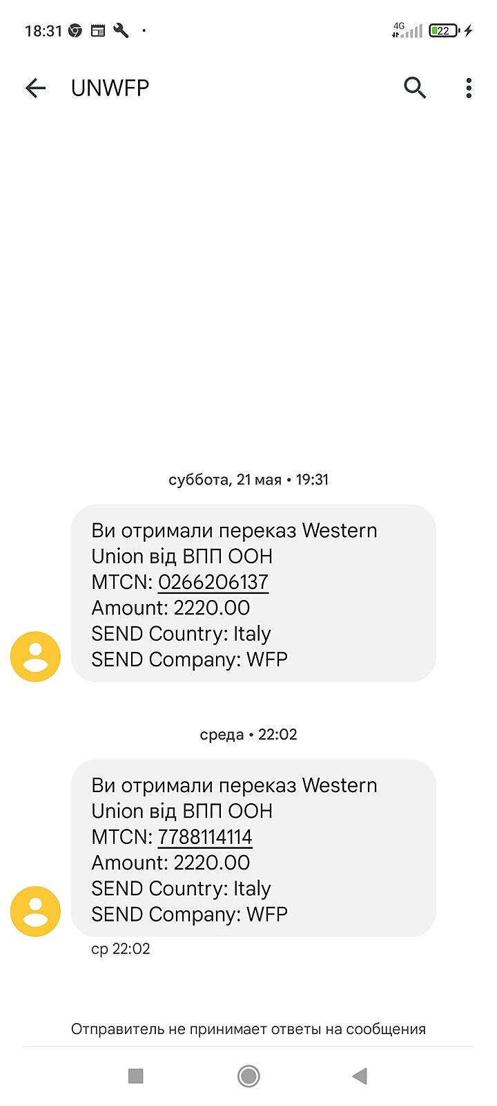 Из нас четверых мне пришла выплата от WFP в мае, потом в июне.