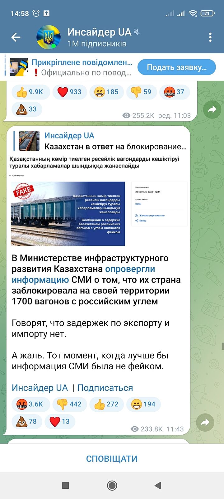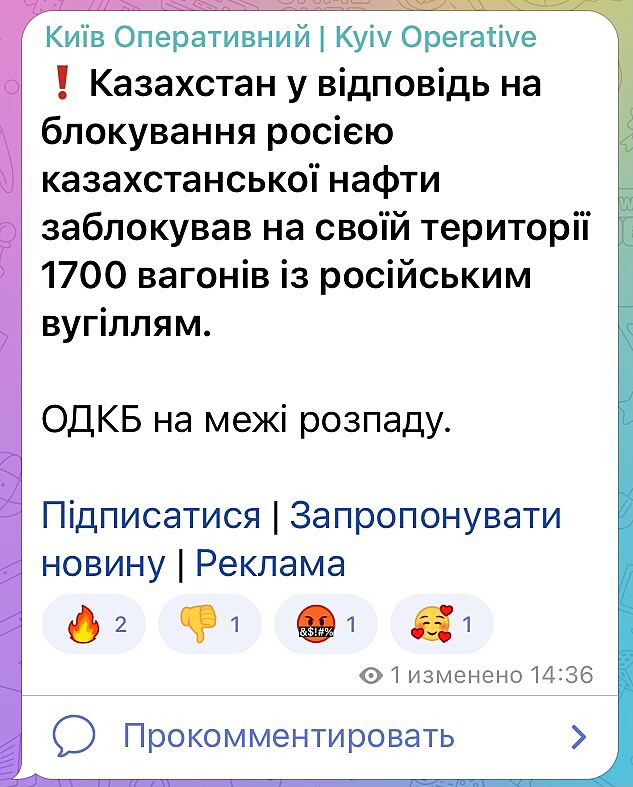 После того, как главный казах втоптал пуйла и заявил, что не поддерживает его «спецоперацию» и считает что Крым и лднр это Украина, пуйло заблокировал казахскую нефть, за что казахи заблокировали рашисткий уголь )