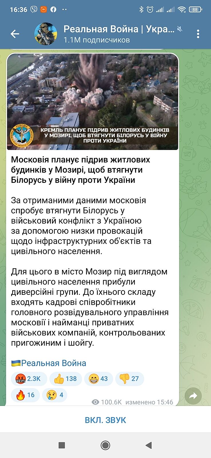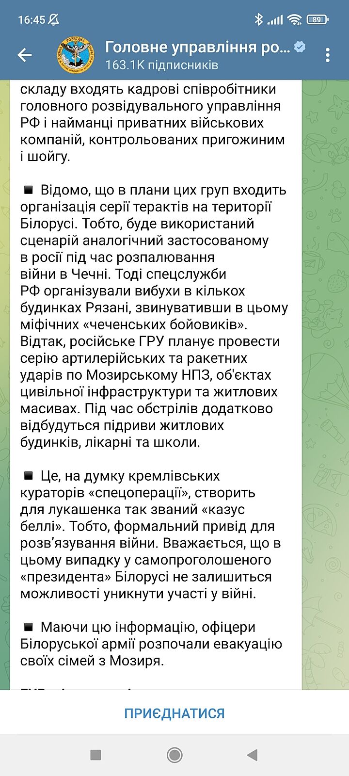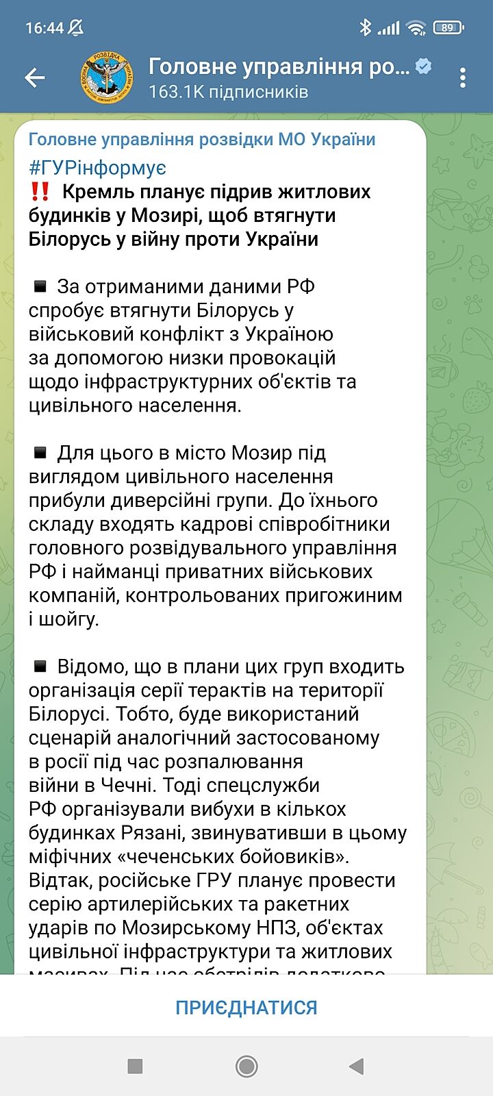 «Відомо, що в плани цих груп входить організація серії терактів на території Білорусі. Тобто, буде використаний сценарій аналогічний застосованому в росії під час розпалювання війни в Чечні. […] Відтак, російське ГРУ планує провести серію артилерійських та ракетних ударів по Мозирському НПЗ, об´єктах цивільної інфраструктури та житлових масивах. Під час обстрілів додатково відбудуться підриви житлових будинків, лікарні та школи», - сказано в сообщении ГУР Украины.