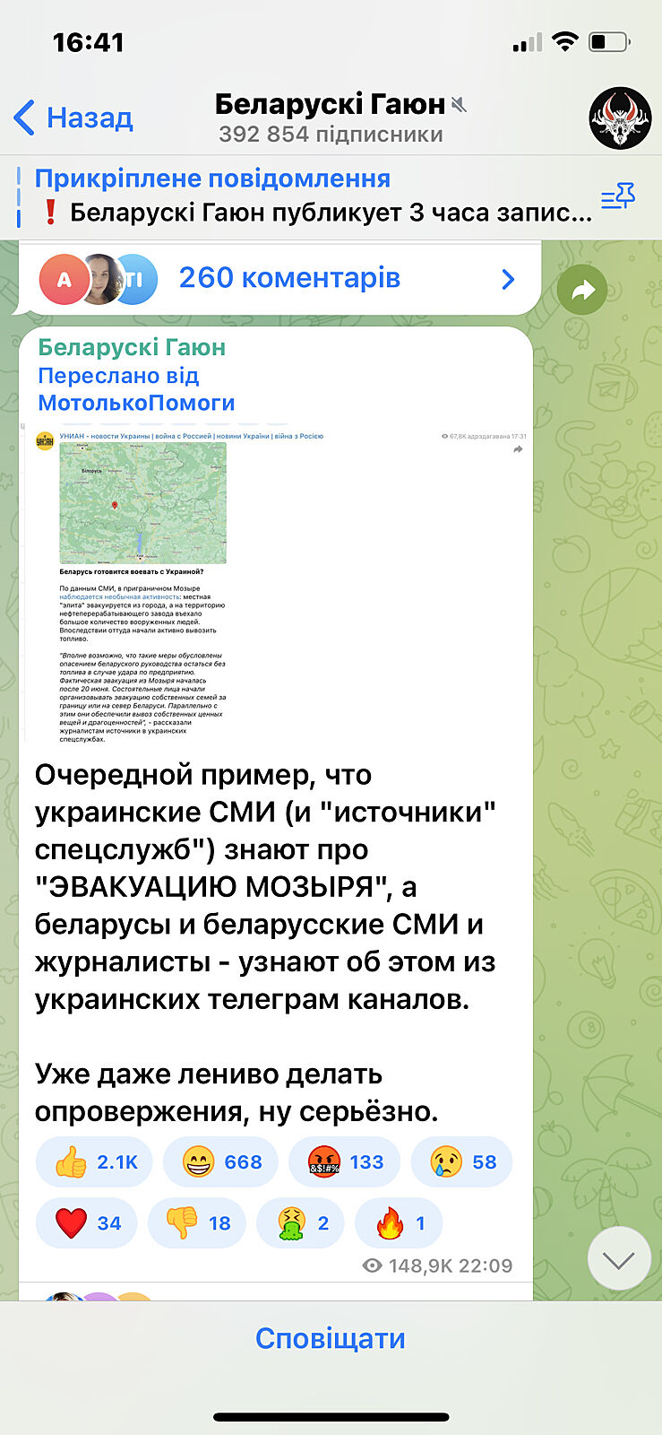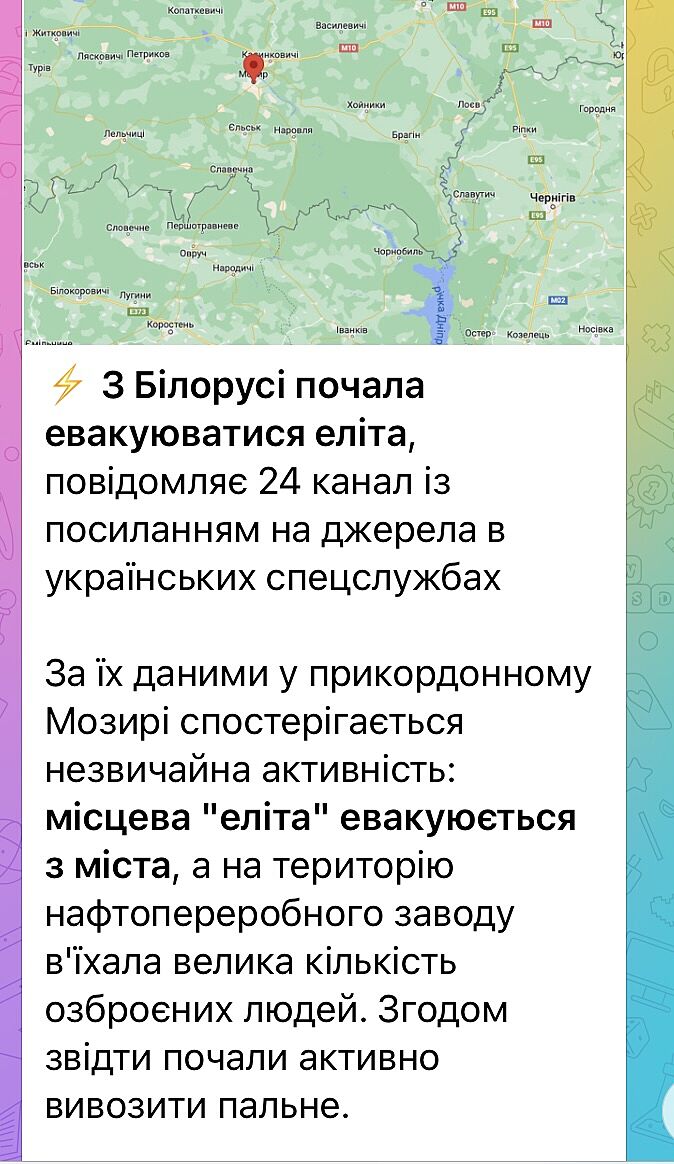 Там много фейков, писали, что элита уезжает из Мозыря и что там вообще чуть ли не эвакуация, а белорусы пишут, что это фейк. Посмотрим.