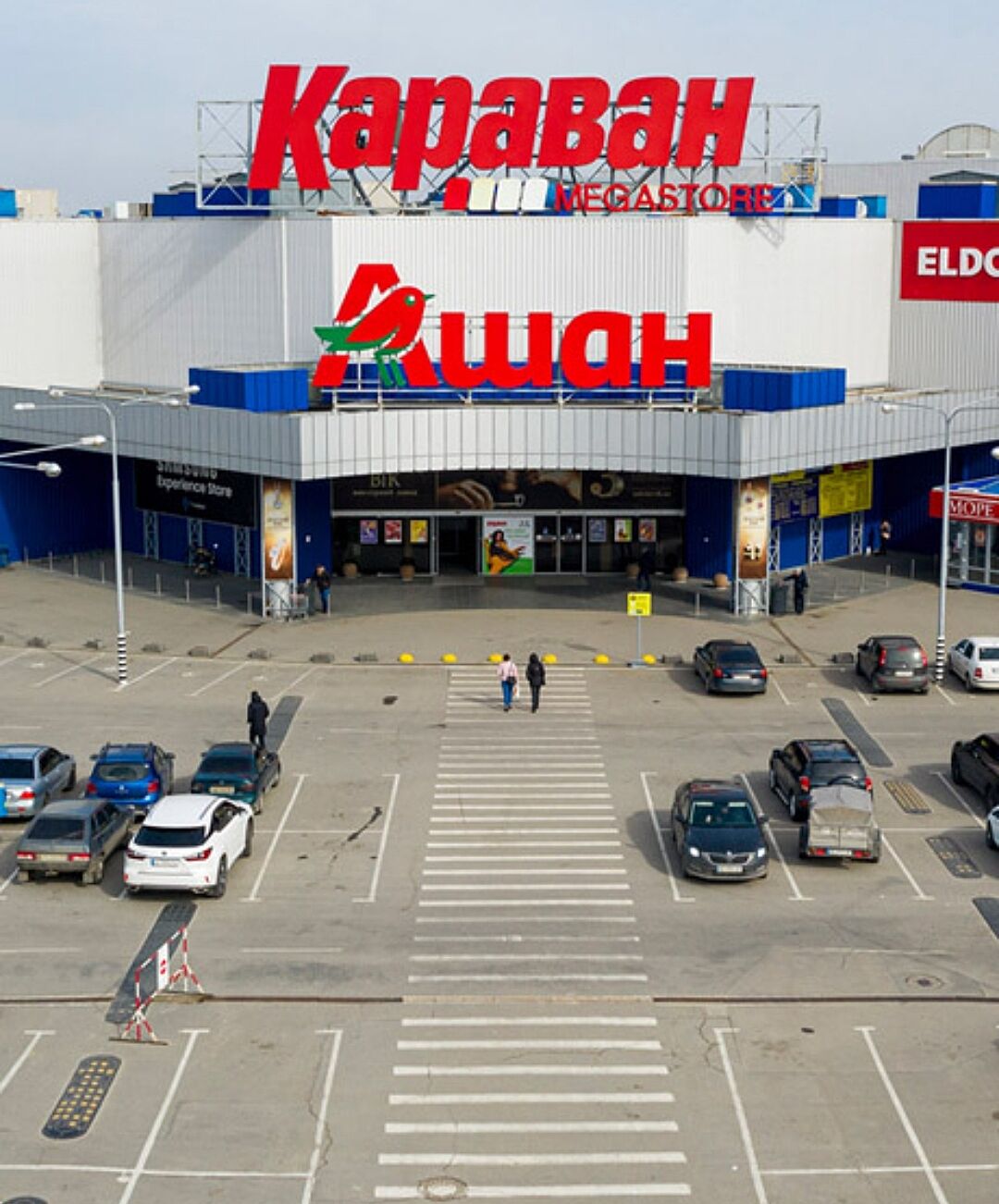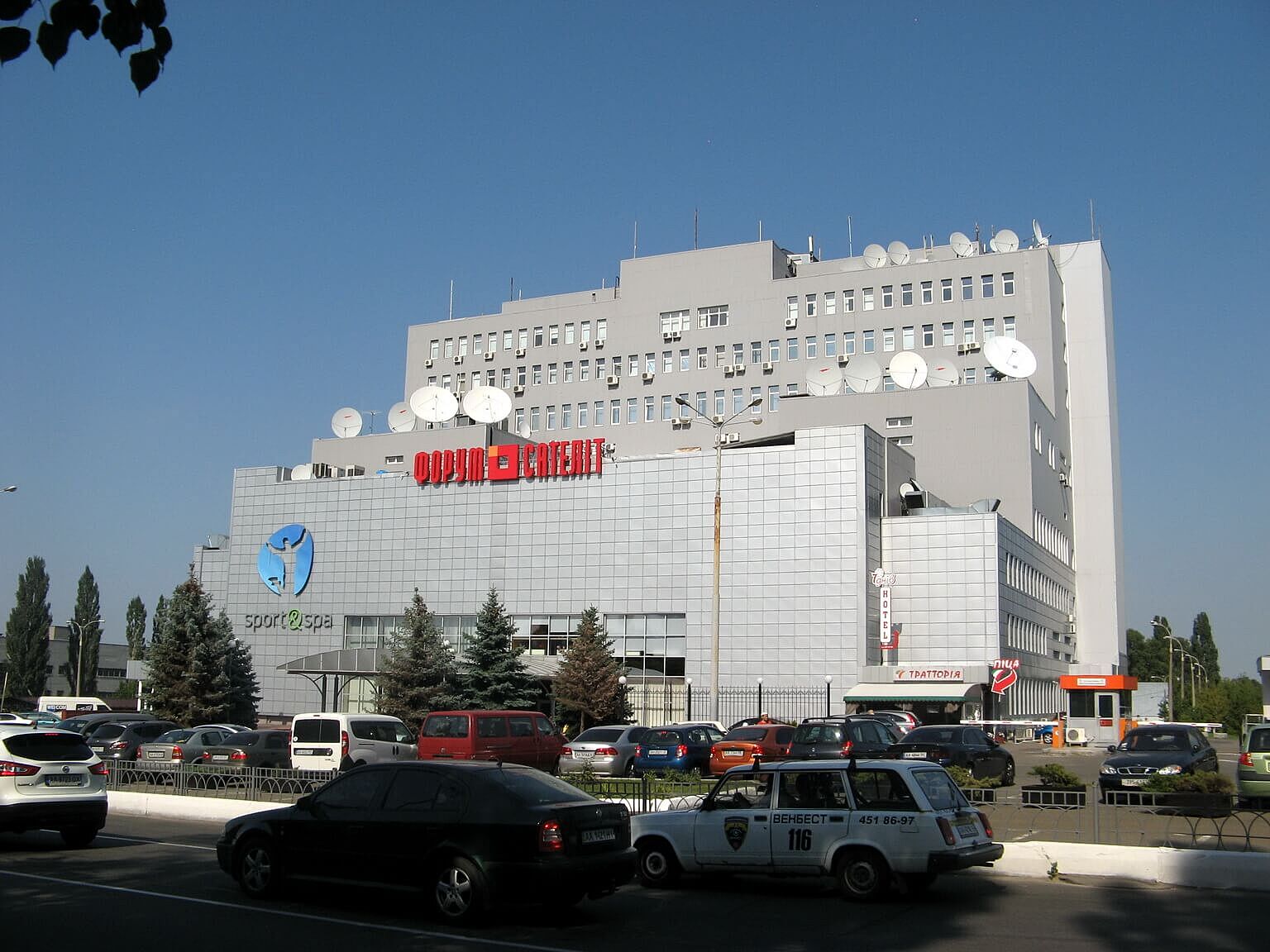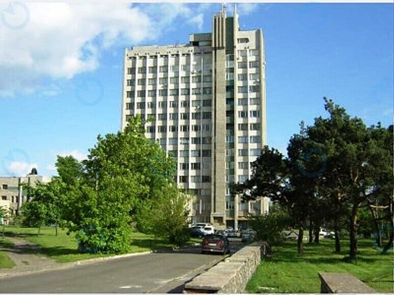 Скажіть будь ласка де в Україні подібний торговий чи офісний центр. Багатоповерхівка, 10 поверхів чи вище. Сірого кольору, будівля трохи старомодна наче ще з радянських часів. Верх чи дах неправильної форми. Ближче до даху вивіска. Слово 7-9 букв окремими крупними червоними літерами. Схожі варіанти на фото.