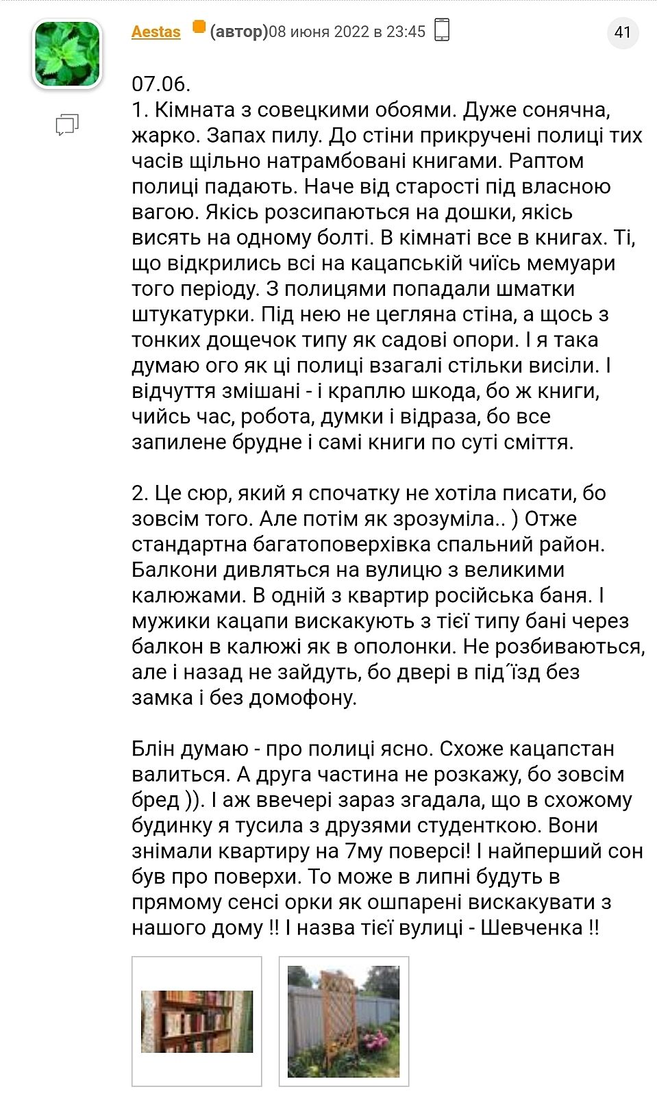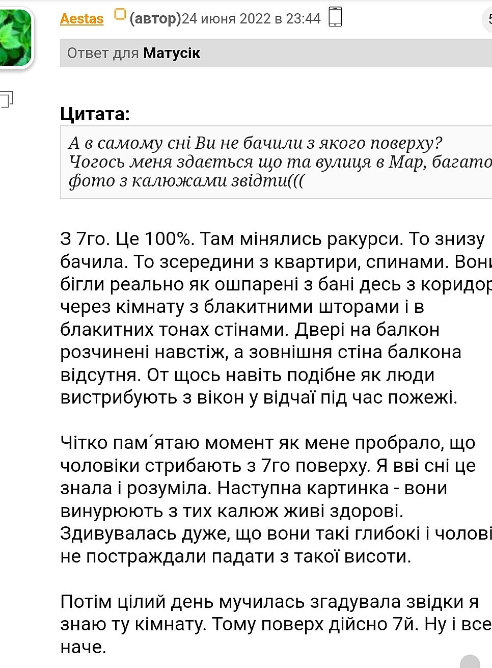Більшість снів в темі февраль 2022. Її закрили на жаль. Додала скріни зі сном про кацапів, що вискакують з 7го поверху і наступний про напад на дівчину. Його продовжили обговорювати тут в новій темі, водія автобуса зрозуміли як генсека. Дуже схожий за статурою.