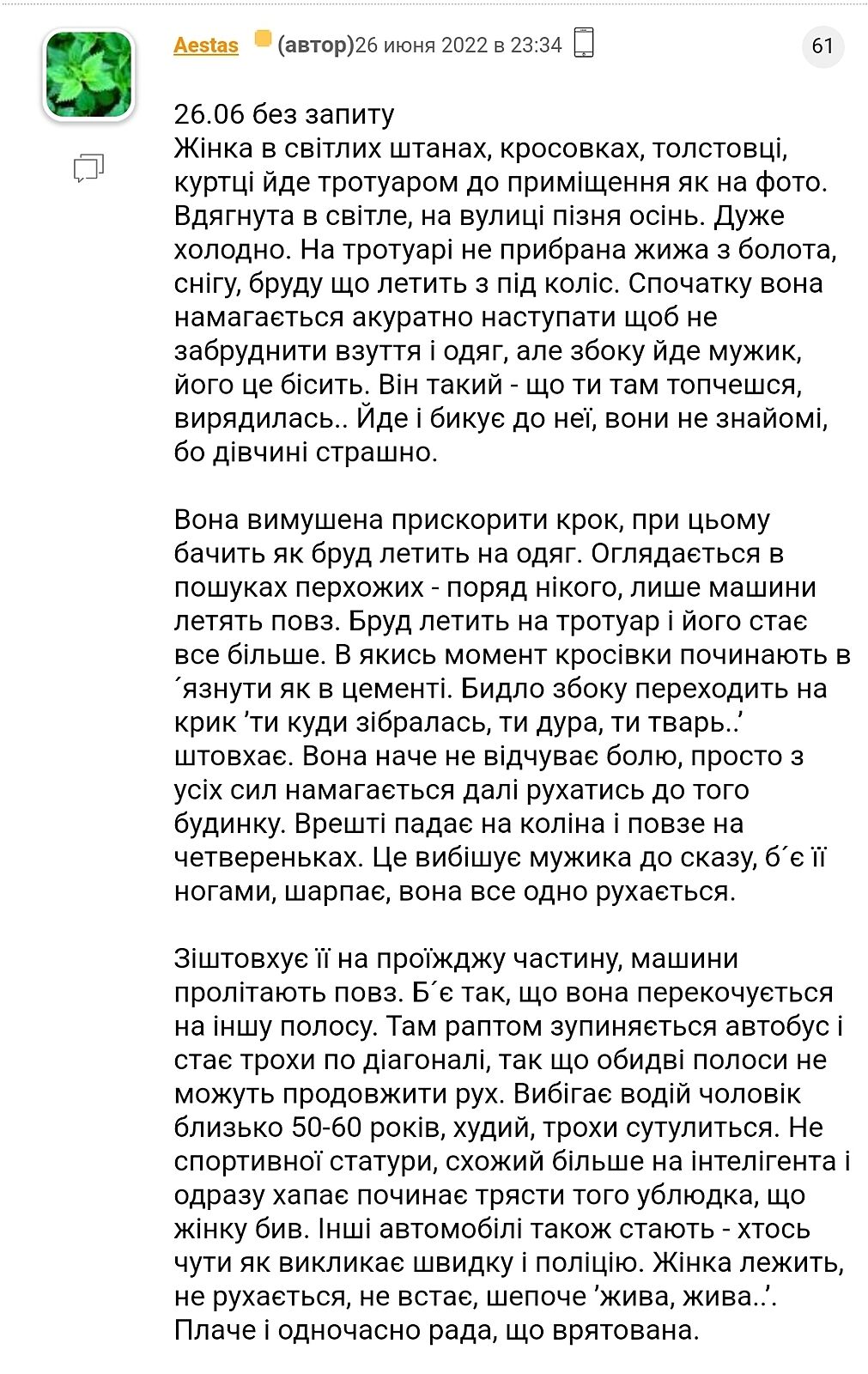 У мене в житті був лише один сон, який мене реально здивував своїм виконанням, практично дослівним, без завуальованості, тому іншим своїм снам не надаю ваги. Але перед війною запамятала один, вирішила написати, бо чимось схожий на вже тут написані. Я в батьківській квартирі. Розумію, що за вікном насувається щось страшне. Ніби буря, жахлива стихія. Темно, спалахи. Перед вікном чути гул. Страшно і не сховатись, хочу закрити штори, але розумію, що це без толку. Навпроти зависає бойовий вертоліт і розумію, що спрямований прямо на нас. І тут бачу як пілот просто махає рукою і все. Я прокинулась, тому навіть не знаю, чи вважати сон завершеним. І тоді вважала, що приснився через нагнітання у пресі. Але хто зна, хочеться вірити у хороше