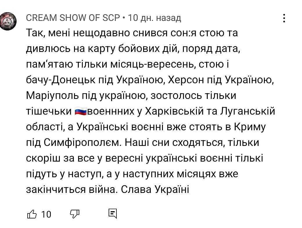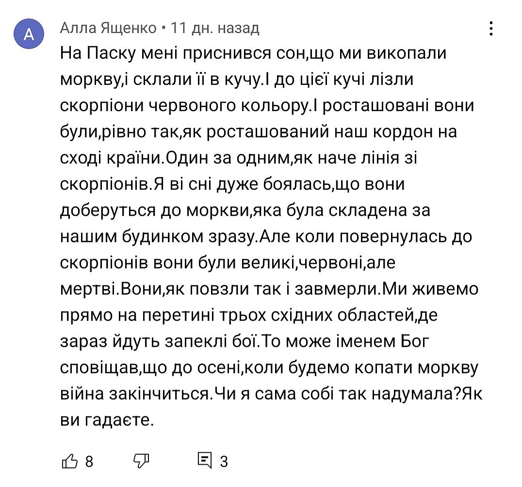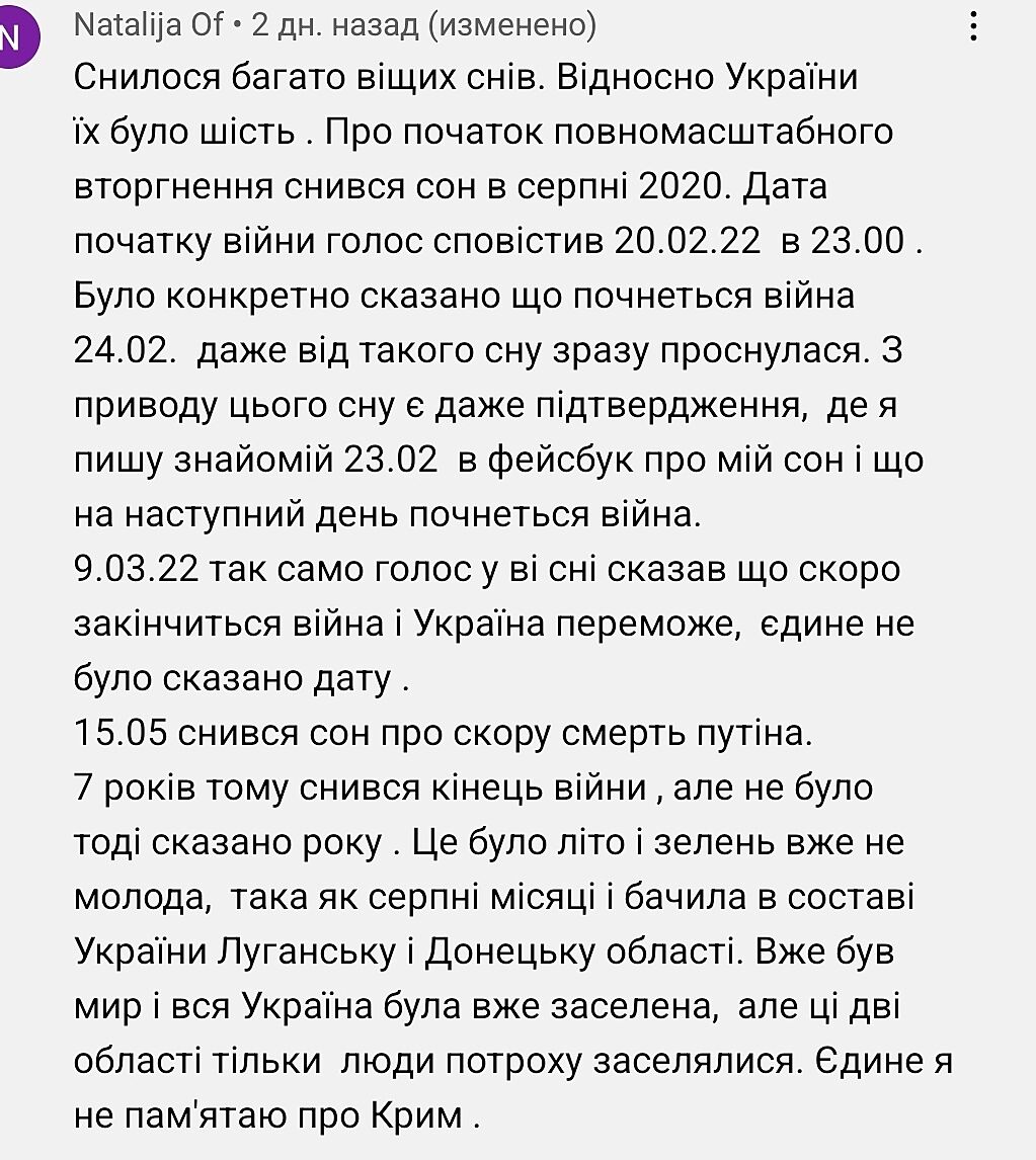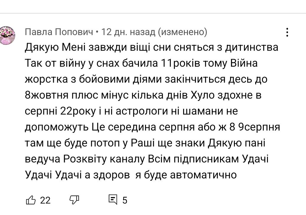 Трапилося мені відео про сон однієї дівчини, вона теж каже що головне літо протриматися, а там щось таке станеться в сусідів, щось прямо дуже шокуюче, і війна закінчиться.