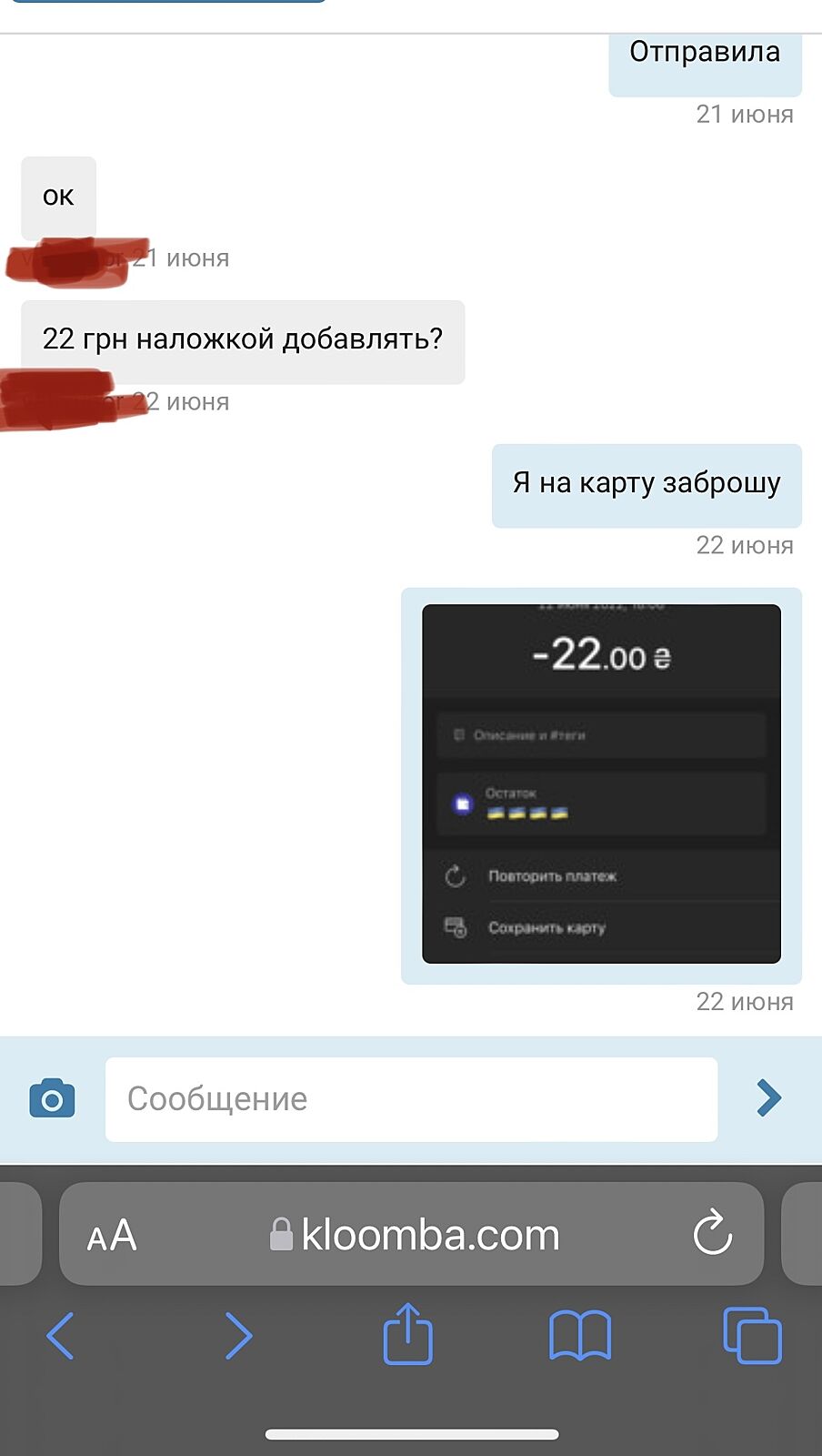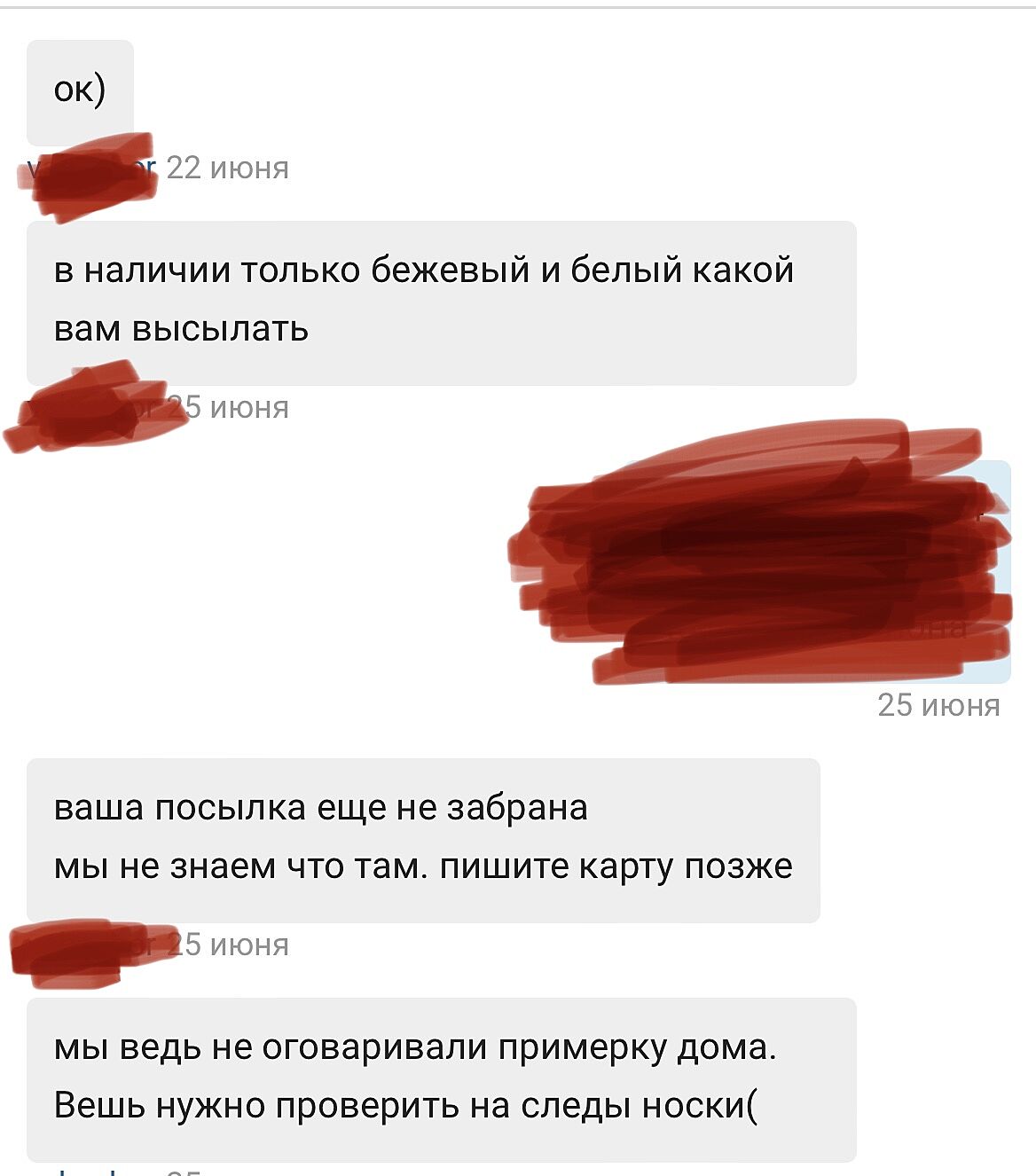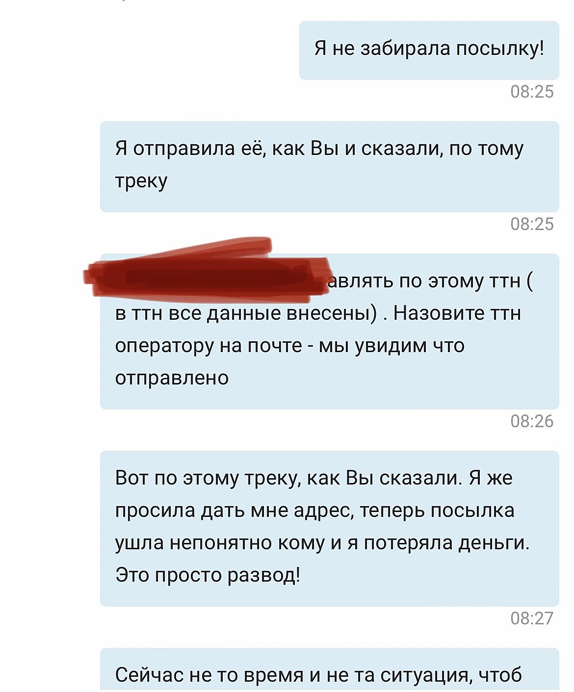Она написала « не забирать «, когда мне уже забрали посылку и я же не требовала деньги сразу, только после получения и осмотра посылки. Посылка с 22.06 на почте, она обманула, что я отозвала посылку, потом сказала, что сделает переадресацию. Почитайте переписку, там всё конкретно.