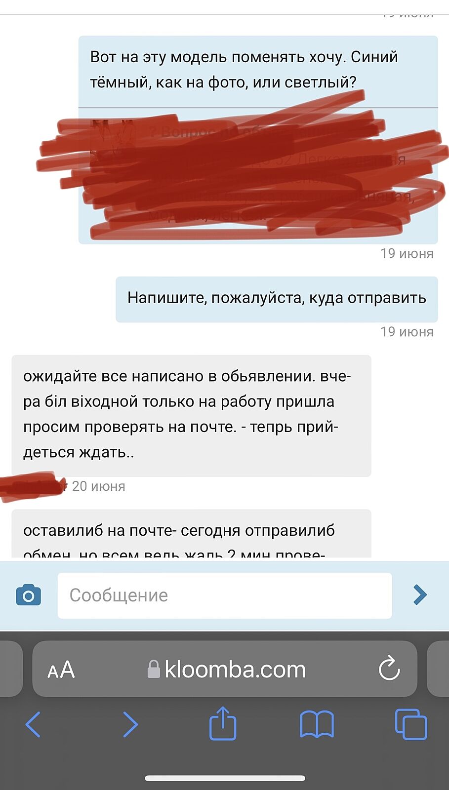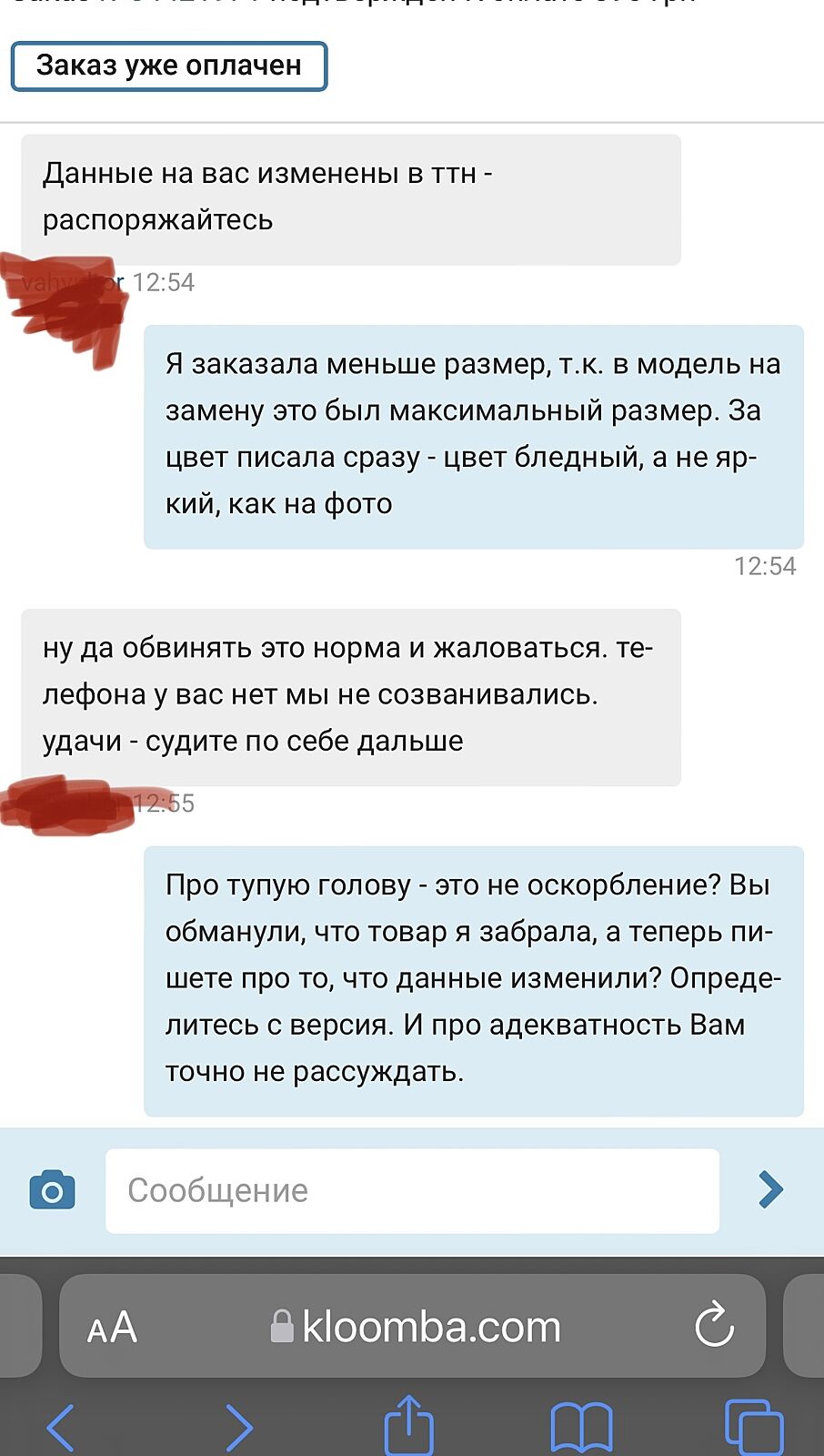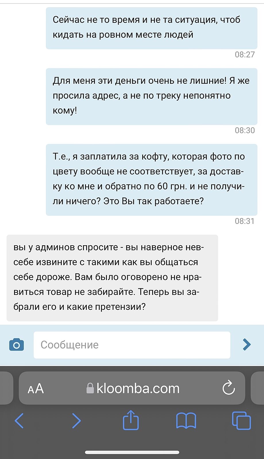 Замовила туніку, довго не могла визначитись між двома моделями, т.я. заміри були тільки на одну модель. Туніка приїхала, але не синього кольору, як була на фото, а блідо-блакитного. Попросила замінити на іншу модель та дійсно синій колір. В об’яві було сказано, що є повернення та заміна. Продавець сказала, що непотрібно було забирать посилку з НП, але посилку забирала не я, тому лише вдома побачила, що отримала. Продавець погодилась на заміну, лише сказала, що прийдеться довго чекать, поки отримають назад, поки перевірять стан і тільки потім вишлють заміну. Я погодилась. Потім виявилось, що синьої немає і я попросила просто повернути кошти. Продавець сказала, що посилку ще не забрали і не оглянули. Чекаю далі. Вчора продавець пише, що кур’єр прийшов на пошту, але посилку я забрала назад. Я нічого не забирала і написала їй про це, написала адмінам того ресурсу. Продавець назвала мене ненормальною, видалила майже всі об’яви свої, змінила правила купівлі в об’явах та сказала, що зробить переадресацію посилки знову на мене, хоча перед цим писала, що посилку кур’єр не отримав. Спочатку пише одне, через деякий час зовсім інше. Я так досі і не зрозуміли вони отримали назад посилку чи ні. Прикріплю лише одне фото з відповіддю від продавцю, це нормально так спілкуватись взагалі?