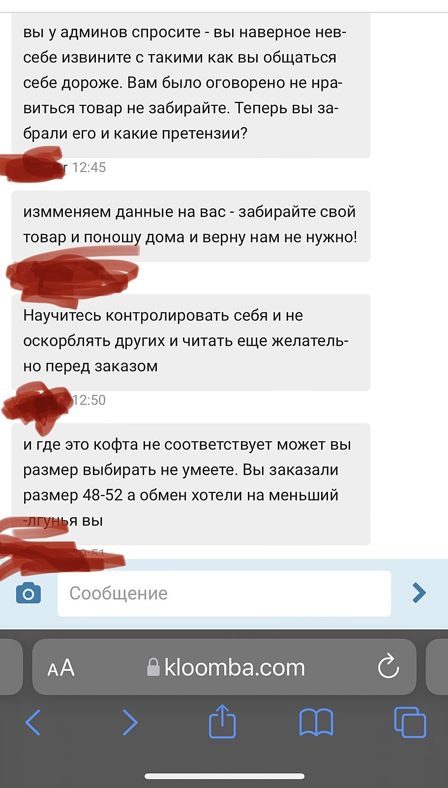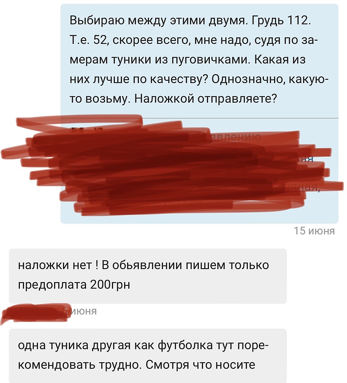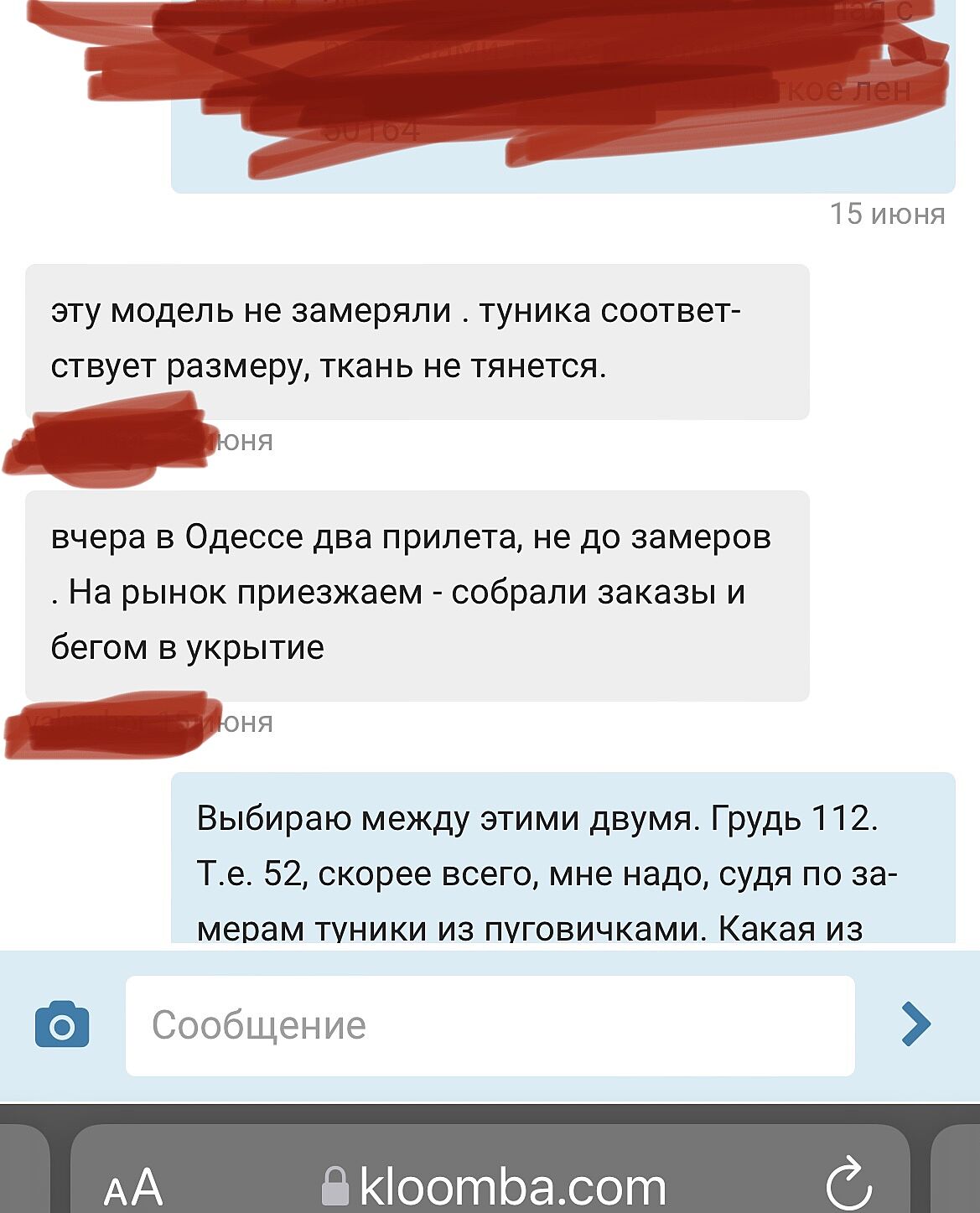 Замовила туніку, довго не могла визначитись між двома моделями, т.я. заміри були тільки на одну модель. Туніка приїхала, але не синього кольору, як була на фото, а блідо-блакитного. Попросила замінити на іншу модель та дійсно синій колір. В об’яві було сказано, що є повернення та заміна. Продавець сказала, що непотрібно було забирать посилку з НП, але посилку забирала не я, тому лише вдома побачила, що отримала. Продавець погодилась на заміну, лише сказала, що прийдеться довго чекать, поки отримають назад, поки перевірять стан і тільки потім вишлють заміну. Я погодилась. Потім виявилось, що синьої немає і я попросила просто повернути кошти. Продавець сказала, що посилку ще не забрали і не оглянули. Чекаю далі. Вчора продавець пише, що кур’єр прийшов на пошту, але посилку я забрала назад. Я нічого не забирала і написала їй про це, написала адмінам того ресурсу. Продавець назвала мене ненормальною, видалила майже всі об’яви свої, змінила правила купівлі в об’явах та сказала, що зробить переадресацію посилки знову на мене, хоча перед цим писала, що посилку кур’єр не отримав. Спочатку пише одне, через деякий час зовсім інше. Я так досі і не зрозуміли вони отримали назад посилку чи ні. Прикріплю лише одне фото з відповіддю від продавцю, це нормально так спілкуватись взагалі?