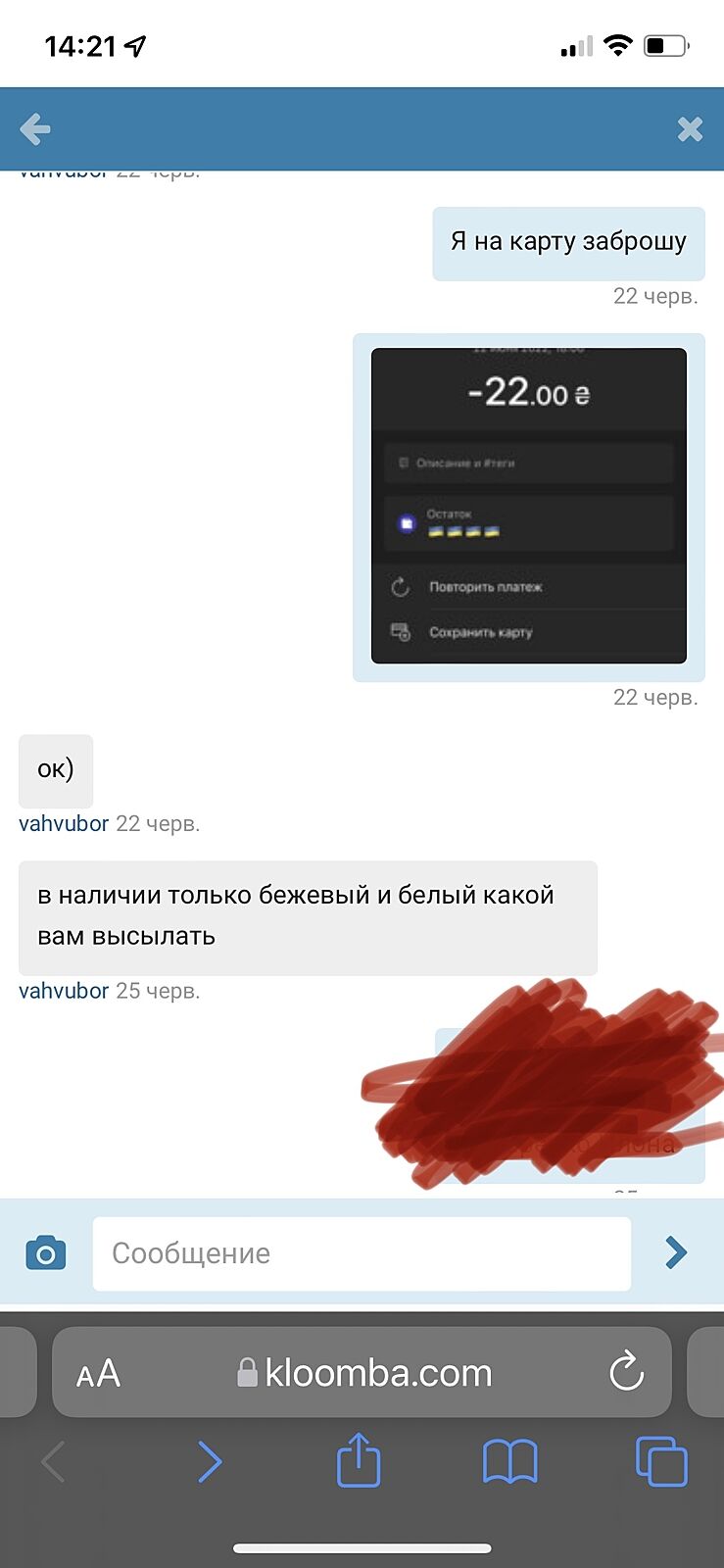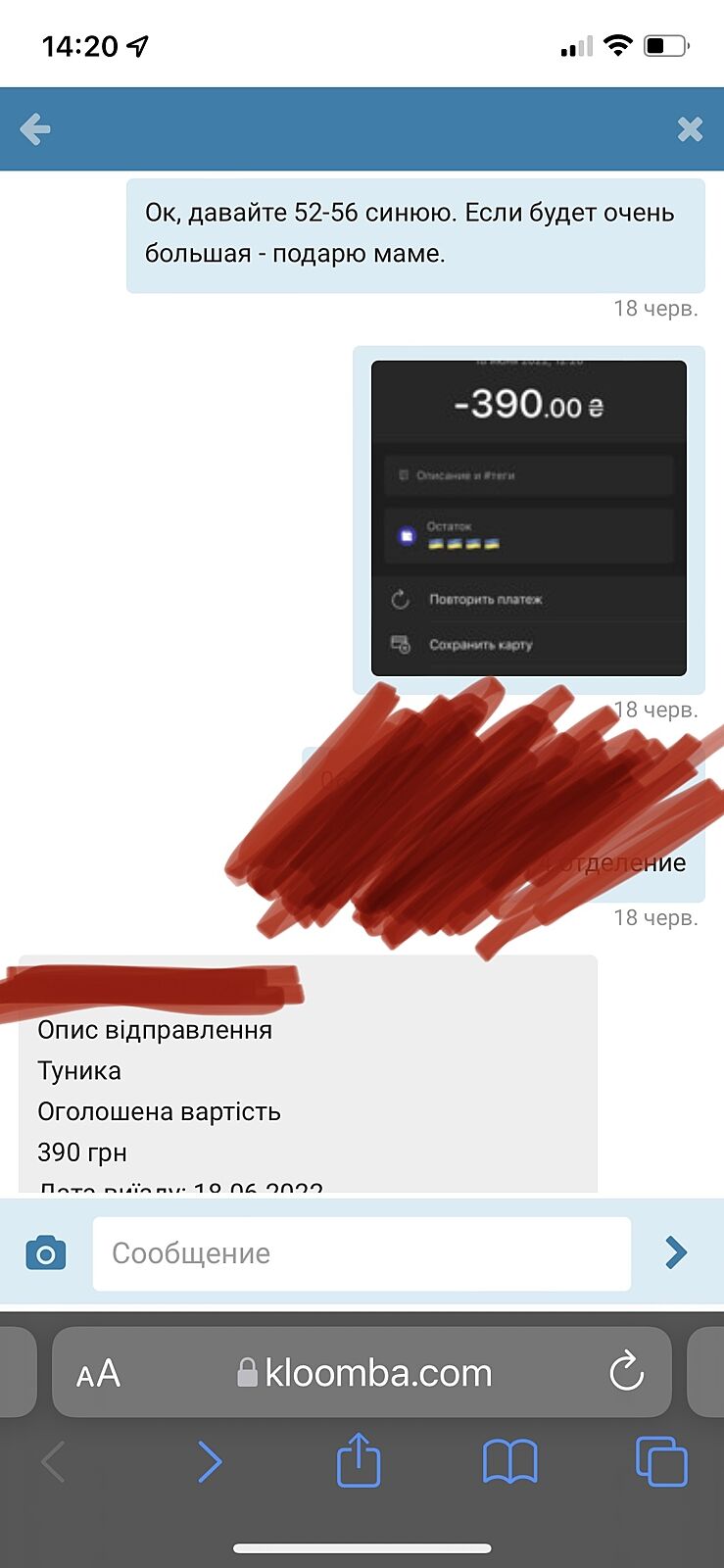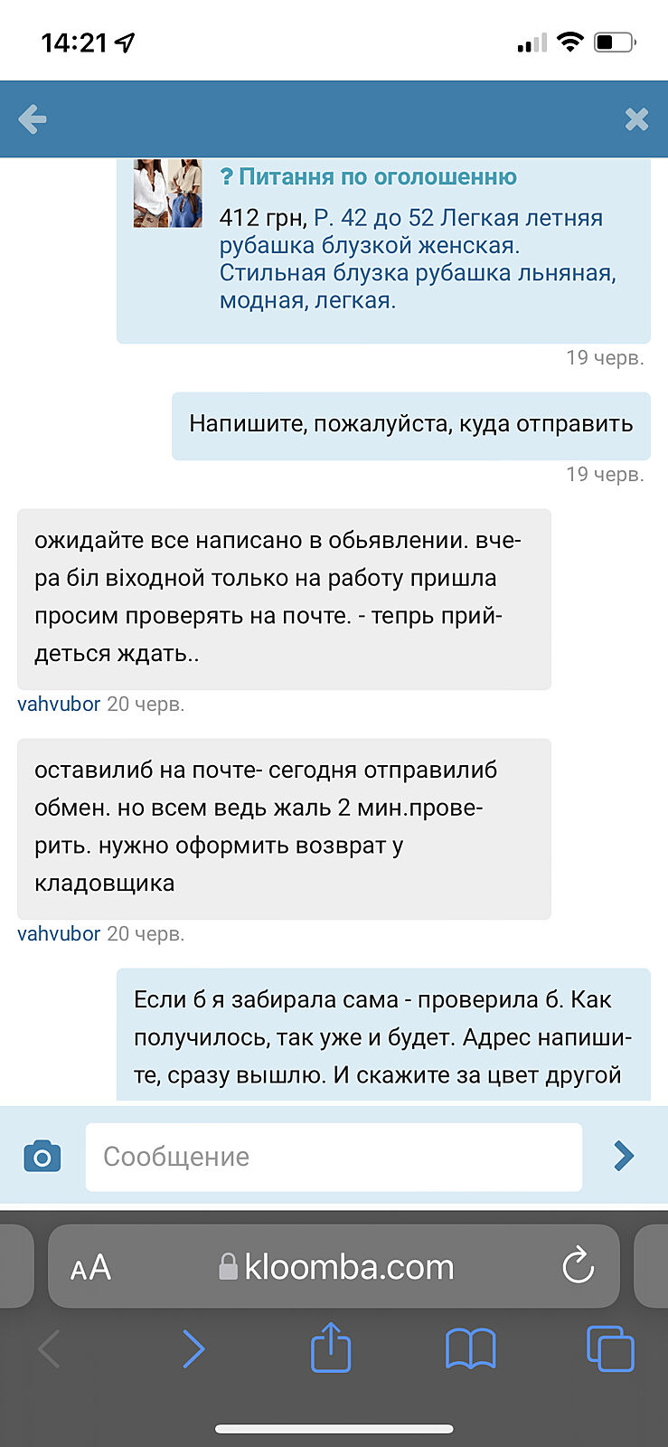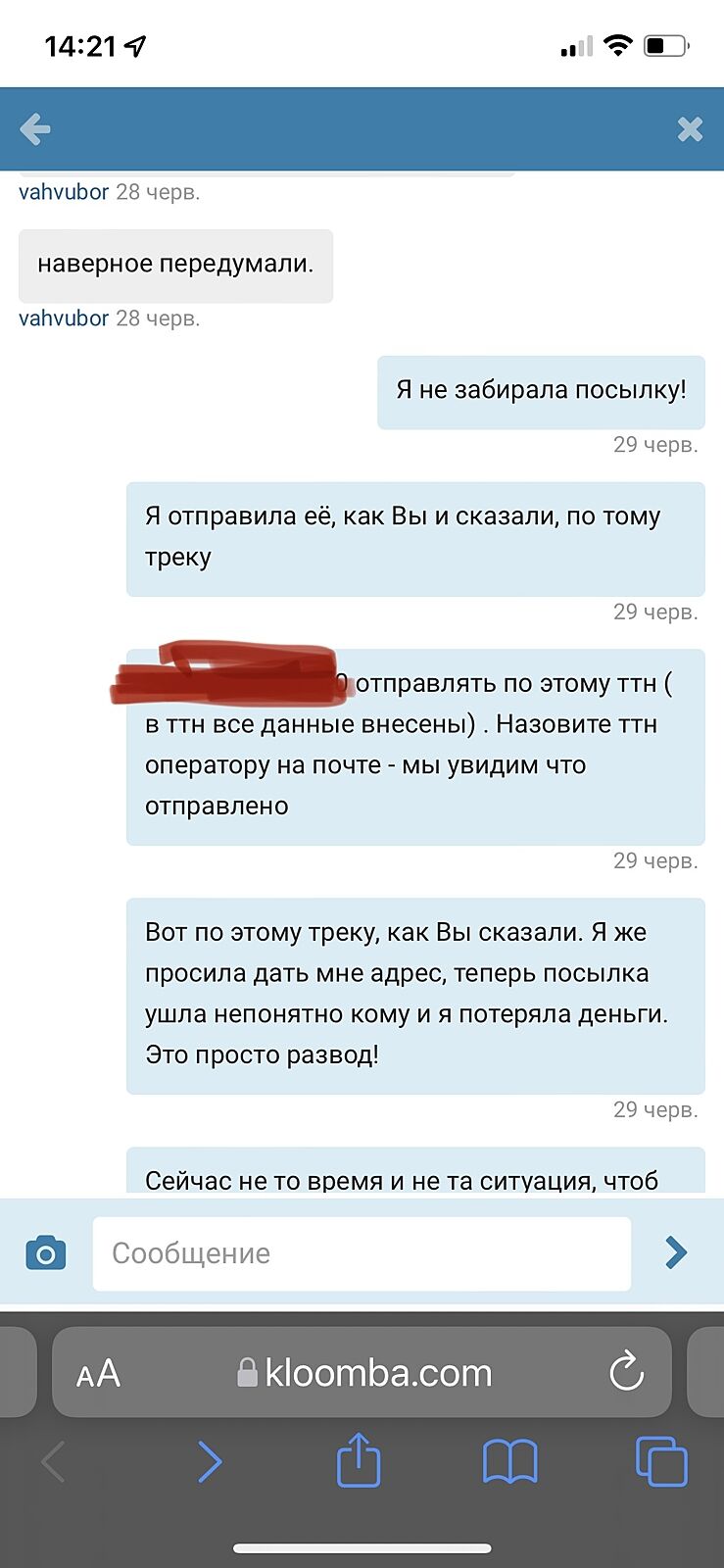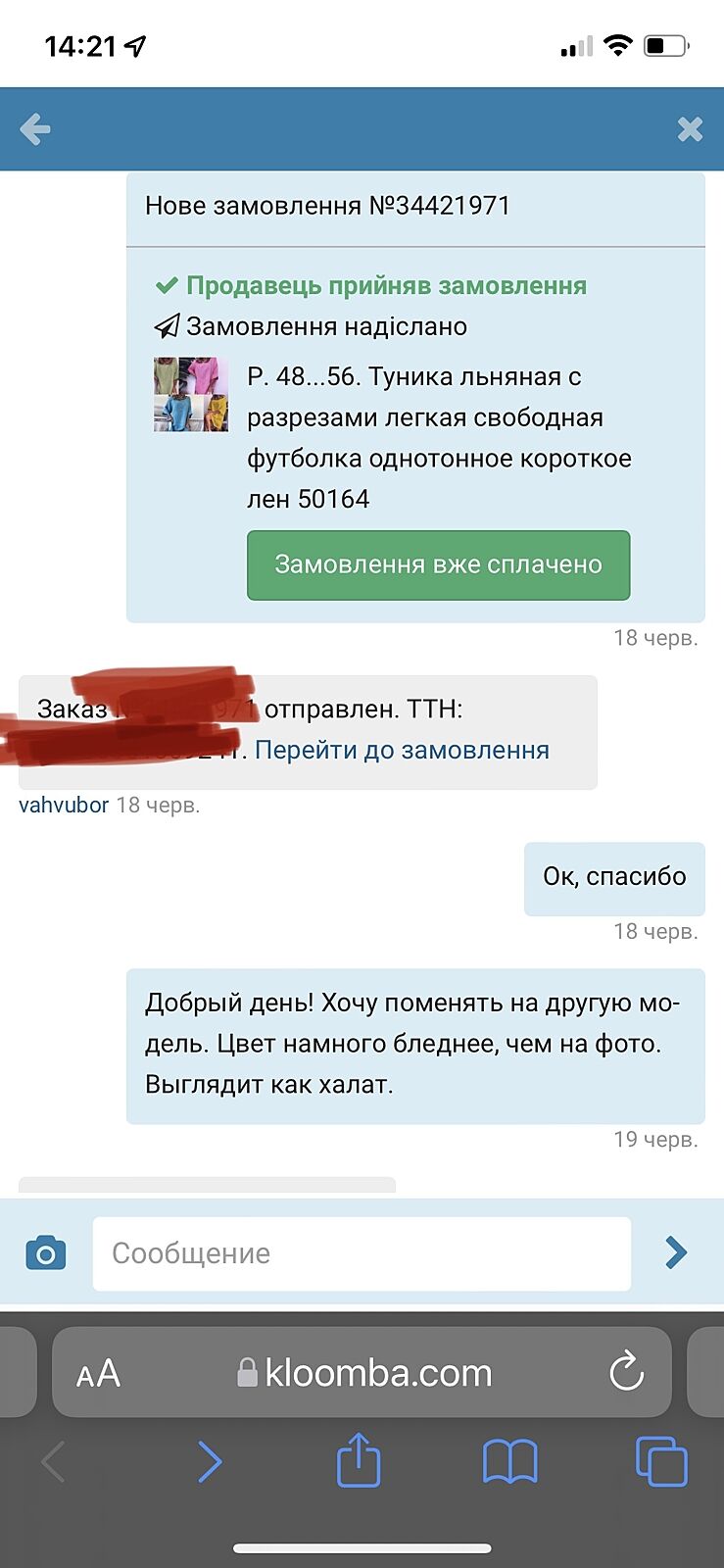 Розумію, що зараз не до розбірок таких, але т.я. продавець веде діяльність і на цьому ресурсі, то вирішила написать, щоб інші не попали. Все подробиці в скрінах. В умовах продавця не було сказано, що якщо я забрала товар із пошти, то про повернення вже не може бути і мови, єдине, що треба було почекать, я чекала поки продавець не написала, що посилку я відізвала, це вже відкрита брехня. Наразі посилка з 22 червня у продавця, вона її не забирає.