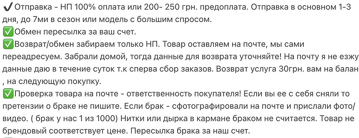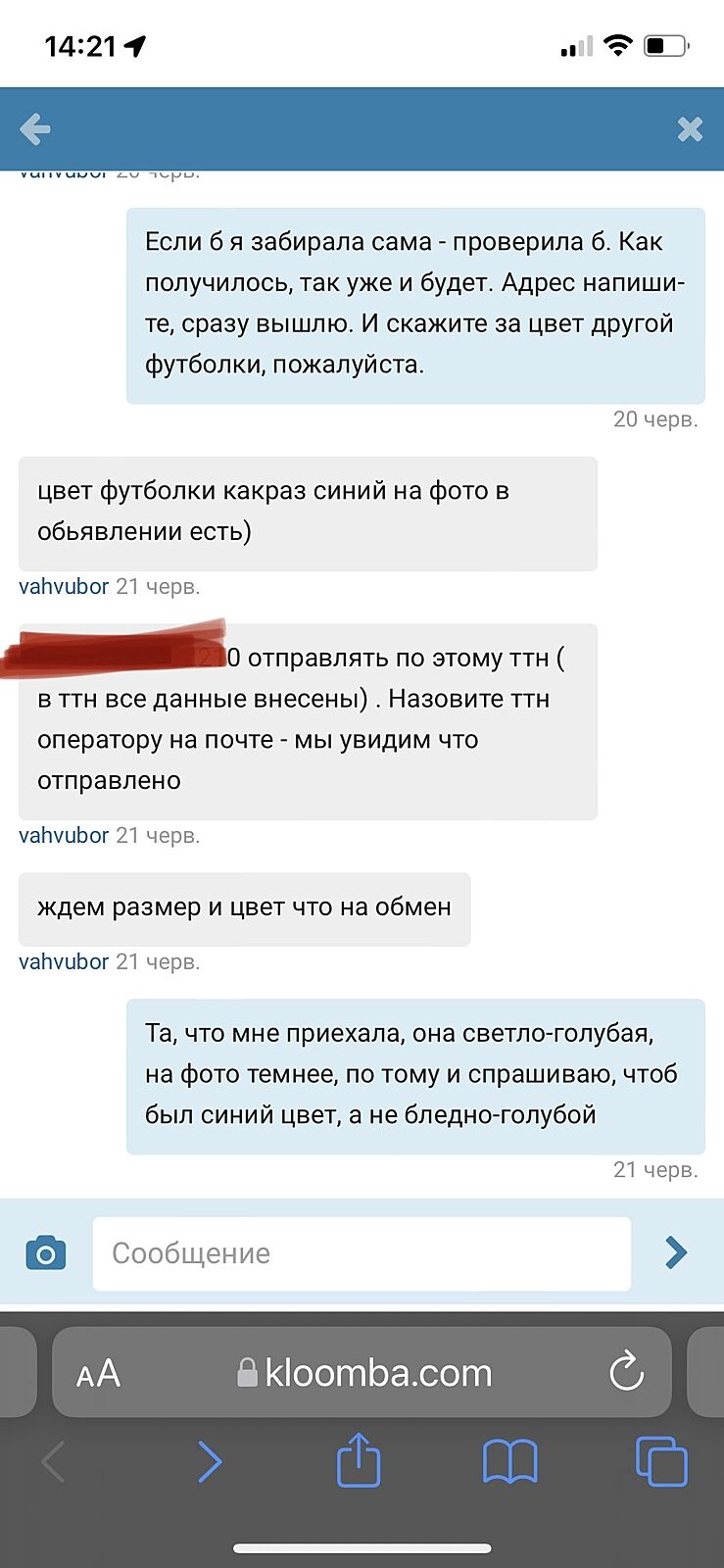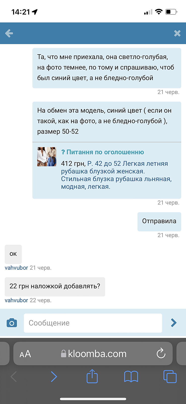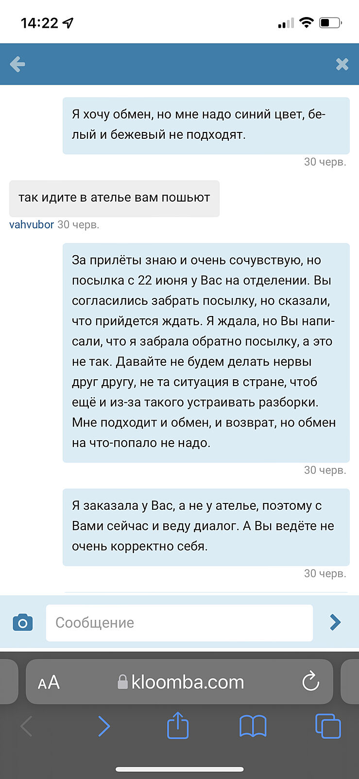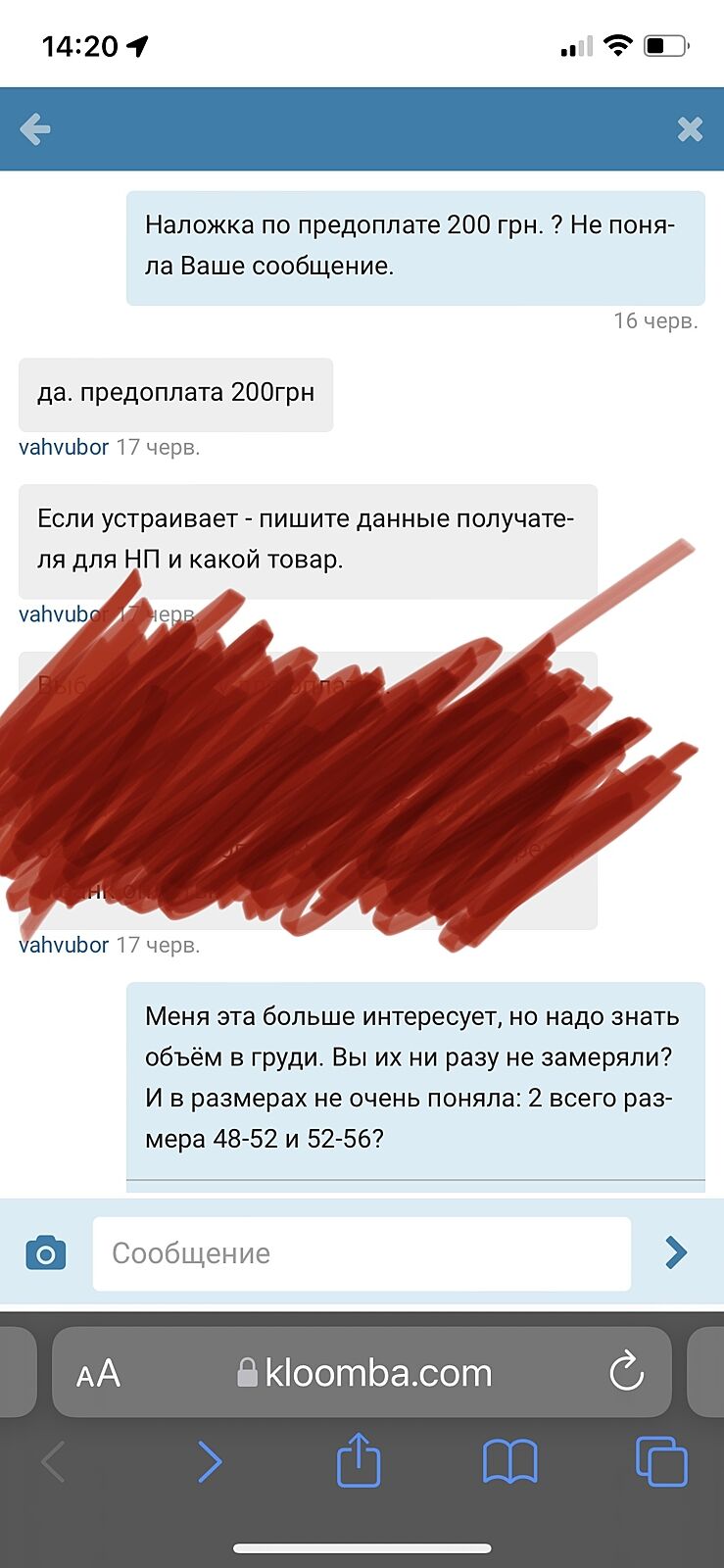 Розумію, що зараз не до розбірок таких, але т.я. продавець веде діяльність і на цьому ресурсі, то вирішила написать, щоб інші не попали. Все подробиці в скрінах. В умовах продавця не було сказано, що якщо я забрала товар із пошти, то про повернення вже не може бути і мови, єдине, що треба було почекать, я чекала поки продавець не написала, що посилку я відізвала, це вже відкрита брехня. Наразі посилка з 22 червня у продавця, вона її не забирає.