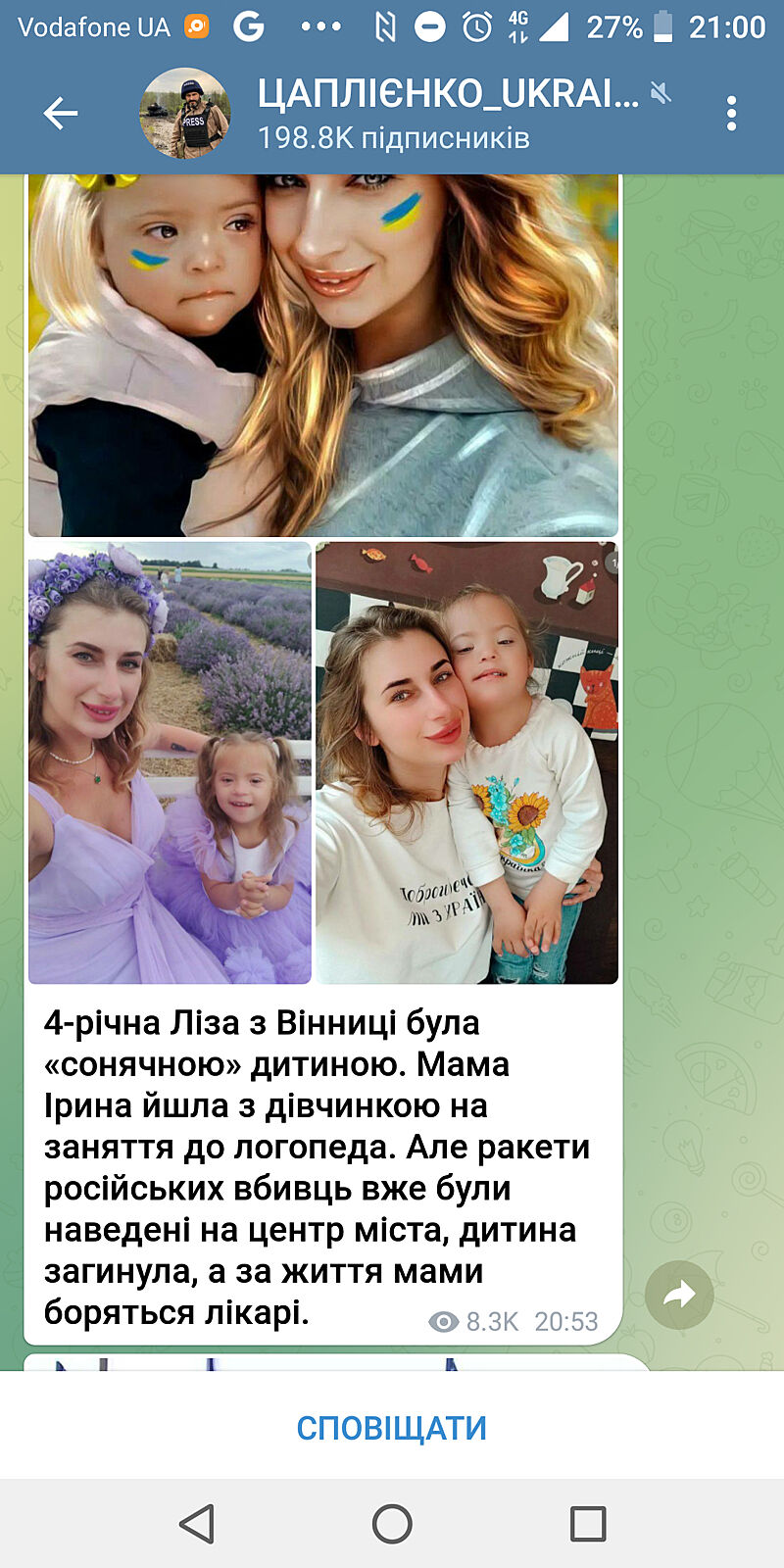 Детям не дают жизни по всей Украине.Отобрали детство,учебу,здоровье,жизни.Твари.Я ещё от фото девочек из Очакова и Киева не отошла,а сегодня погибшую Лизу увидела у Невзорова.Хоть бы замылил частично.Я каждую трагедию через себя пропускаю и мечтаю,чтобы война закончилась.А новости не утешительные.