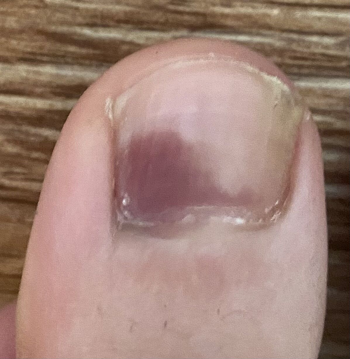 Был на ногтях онихолизиз, не беспоил, пустота возле края около года. Пару дней назад начал болеть ноготь при нажиме, и вот сегодня он фиолетово синий и болит