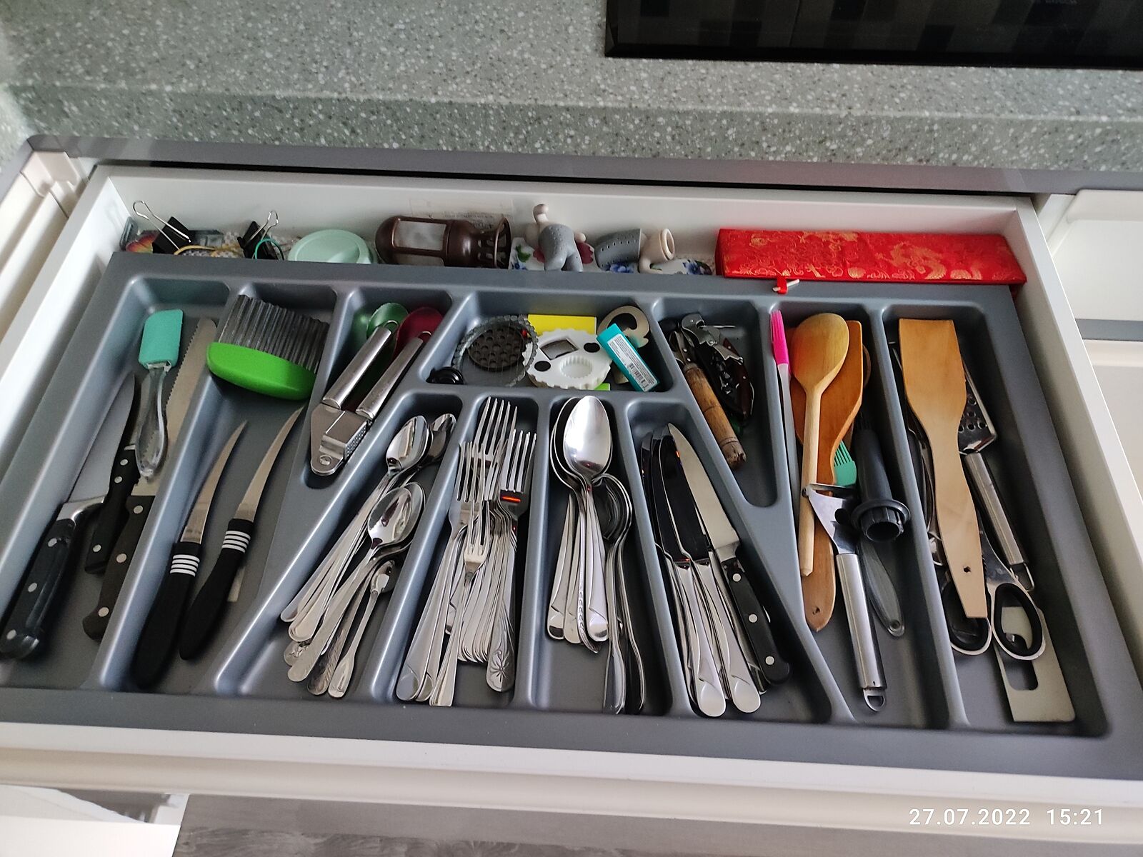 Как организовали такой ширины ящик? Нужно вместить туда столовые приборы, набор кухонных принадлежностей и ножей, в идеале еще место для специй выделить.