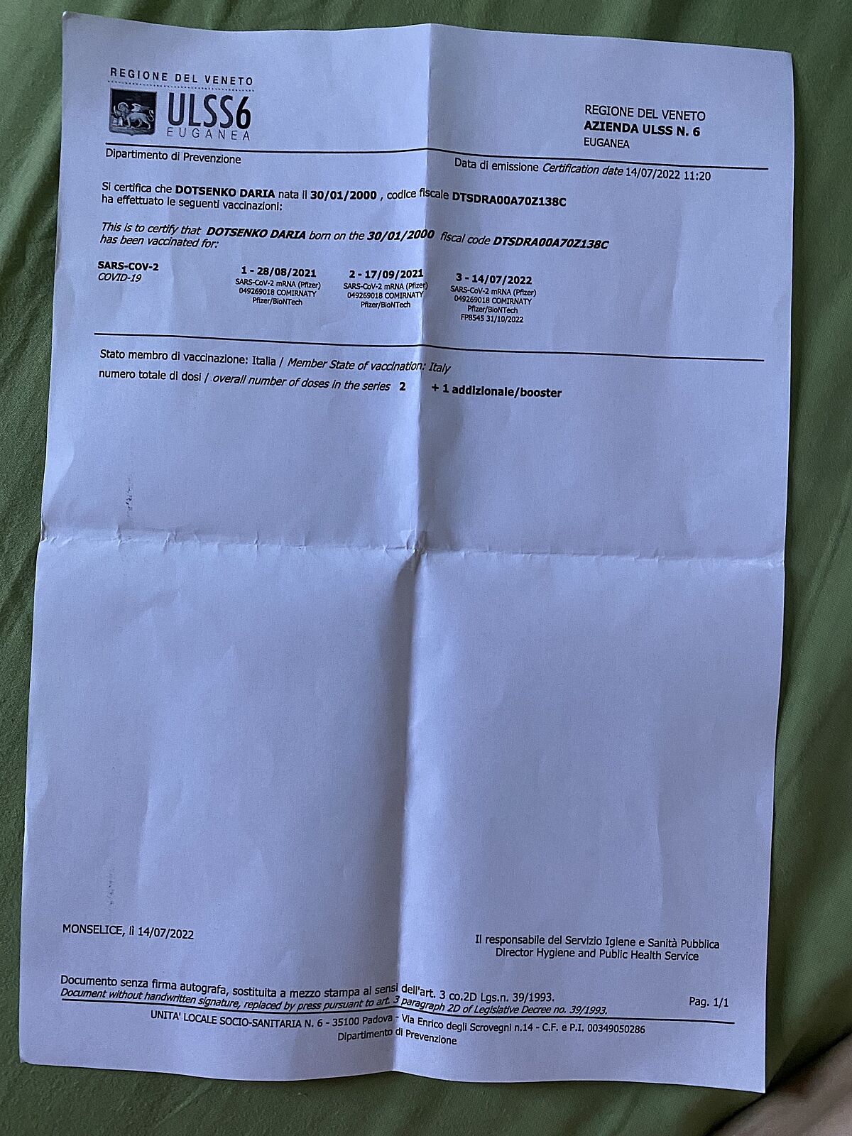 Здравствуйте. Кто знает, подскажите, пожалуйста: у меня было 2 прививки файзер, сделанные в Украине и отображающиеся в Дие. 14.07 я сделала 3ю вакцину уже в Италии, после которой мне выдали такой ‘документ’ (прикрепляю фото). На нем ни кьюар кода, ни печатей. 3я вакцина мне нужна была для вылета. Где я сейчас могу получить документ с кодом, который можно предьявить в аэропорту (электронный или бумажный)?