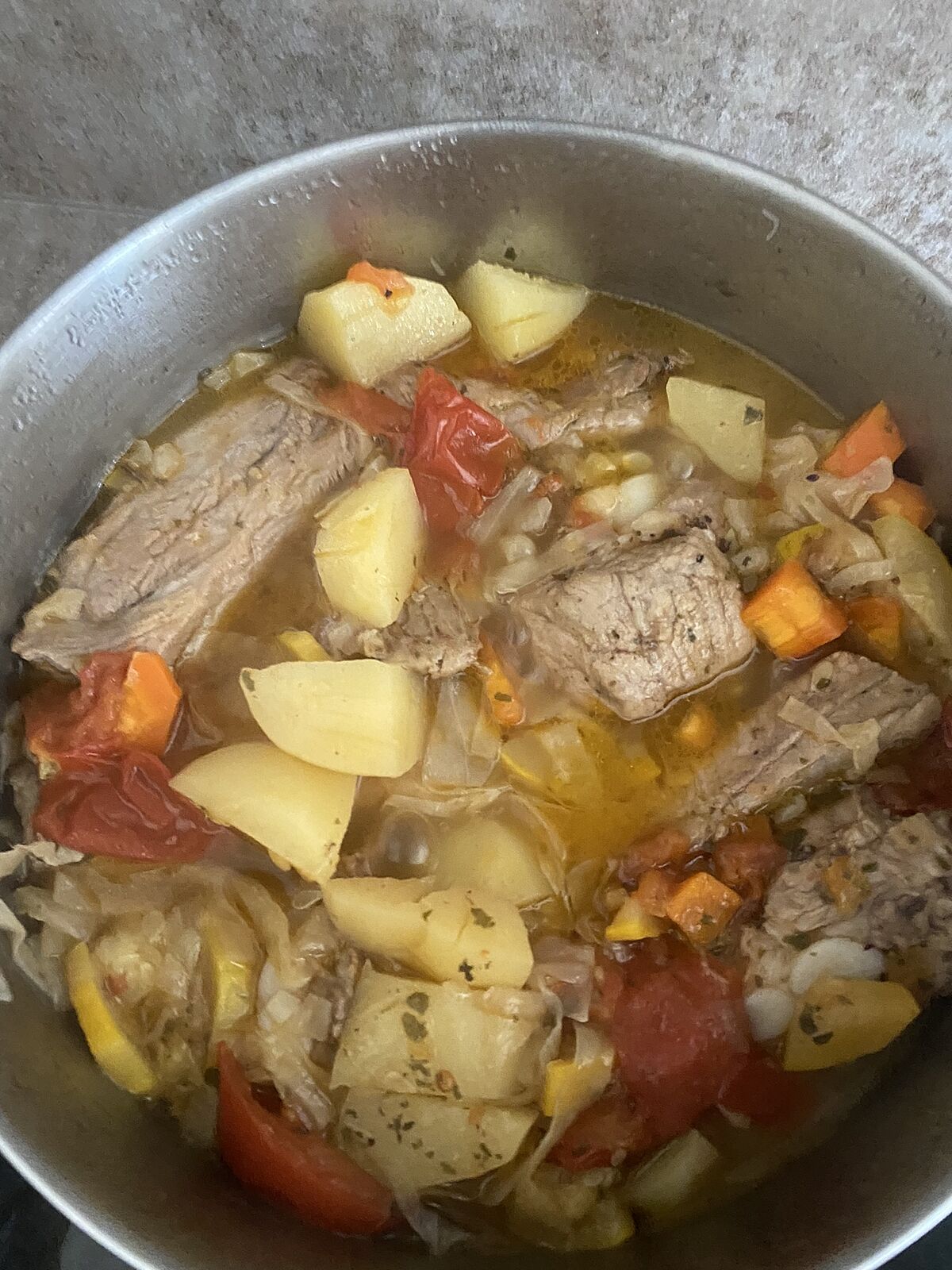 Жареные кабачки и отбивные куринные. Борщ с фасолью, пирог со сливой, гарнир рожки