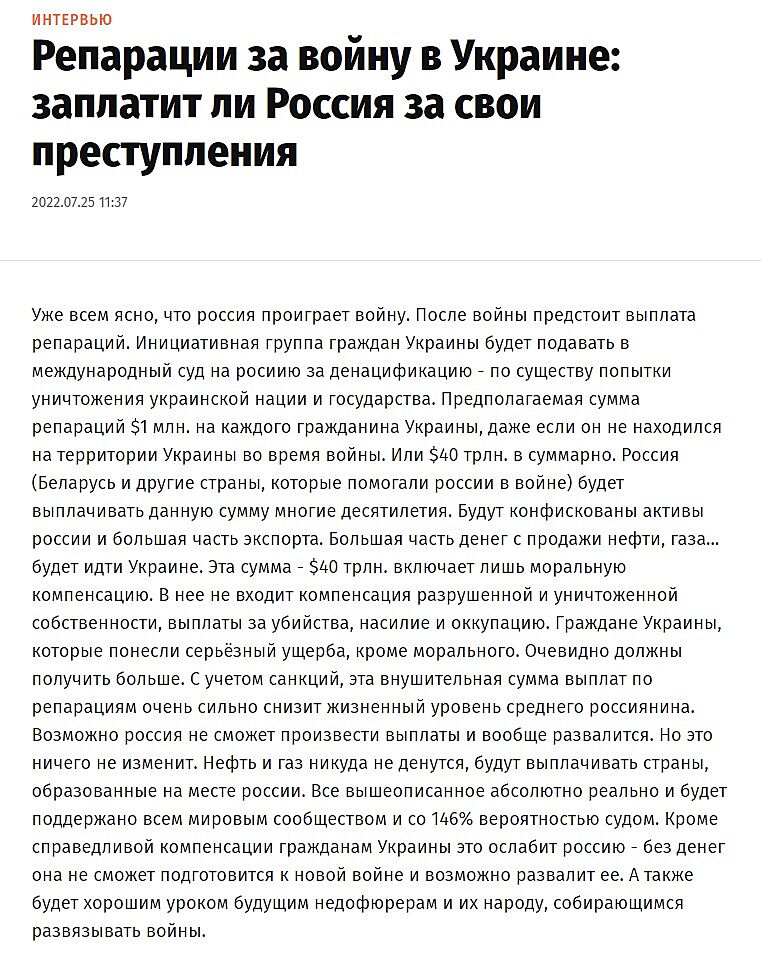 Уже всем ясно, что россия проиграет войну. После войны предстоит выплата репараций. Инициативная группа граждан Украины будет подавать в международный суд на росиию за денацификацию - по существу попытки уничтожения украинской нации и государства.