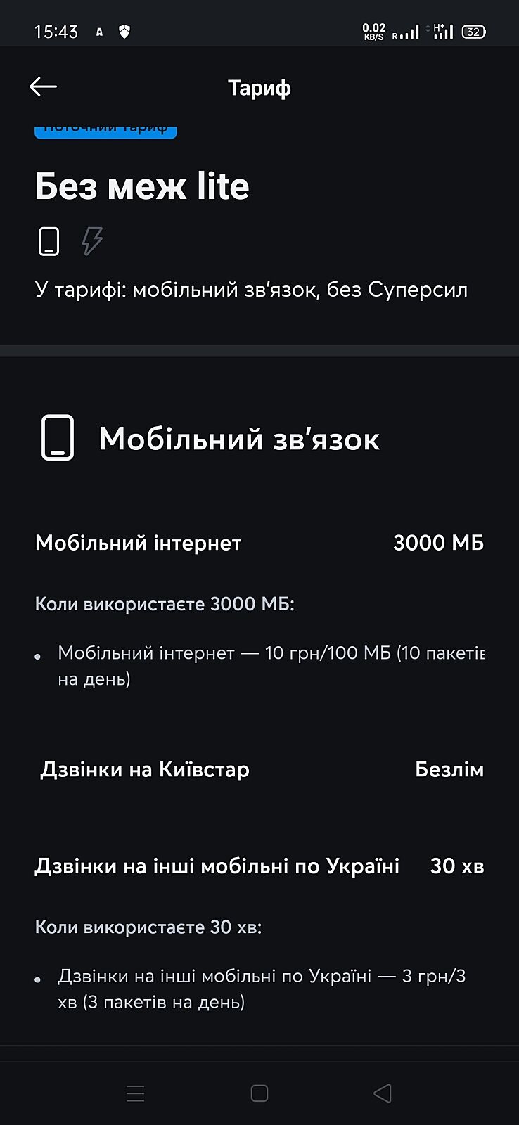 Я уже полтора года в Марокко, телефоном не пользуюсь, но держу активным. Так вот дома было 75 грн тариф, недавно подключила дешевле, но не пользовалась, само собой. Дай бог, после войны приехать домой. Маме не платила месяц - смогла переподключить с 75 грн на 55: у нас дома вайфай, интернет ей как бы ни к чему. А у меня сейчас такой висит: