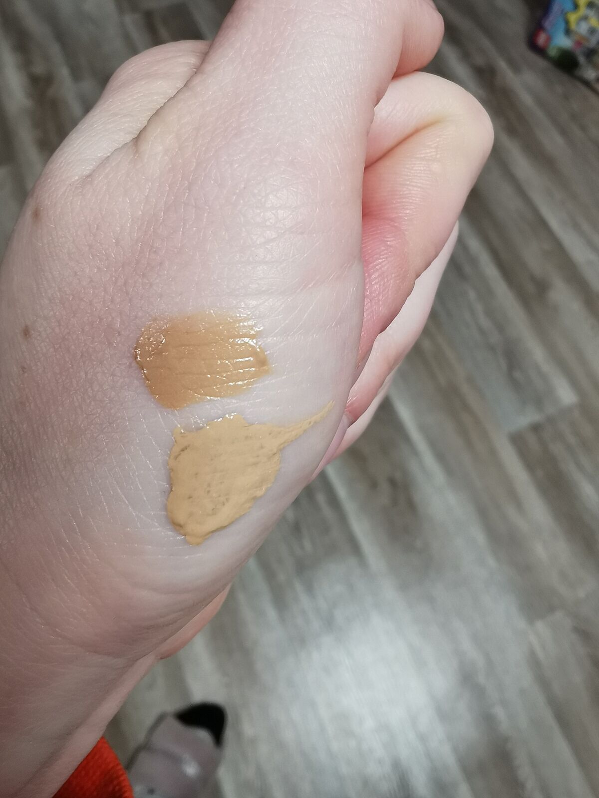 Дивіться, той що світліший, то в білому тюбику, а той що зверху та темніший то з набору в мішечку. Перший як би пристосовується до шкіри і стає ще світлішим.