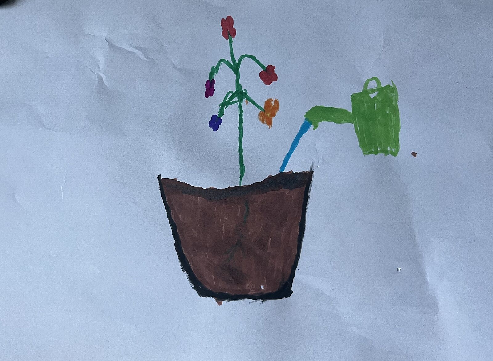 Если серьезно, то большое внимание сын уделил горшку с землёй, коричневого много. Хотя с другой стороны может это означает ,,близость к корням, истокам,,