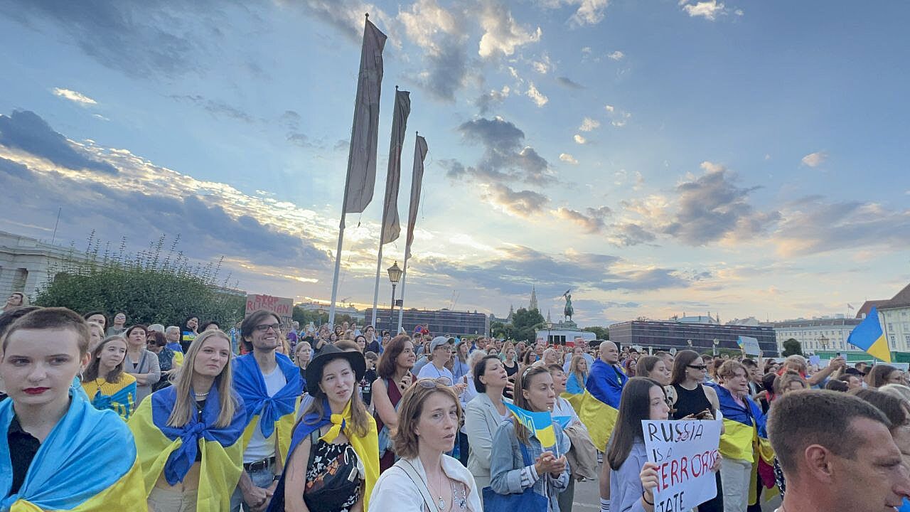 Справа - це Відень. Там також взнали про страшний злочин рашистів і трагедію українців та вийшли на акцію протесту й солідарності.