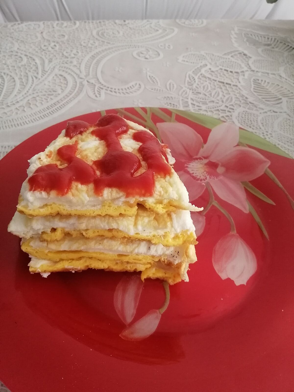 Например разбила 5 яиц, взяла одну полускорлупу и налила 5 таких молока, типо мерный стаканчик) потом соль. На сковороду чуть раст. масла и туда кусочек сливочного( тогда сливочное не горит) и на медленном огне под крышкой. Он аж под самую крышку поднимается, потом немного падает, но не критично. Складываю пополам и режу