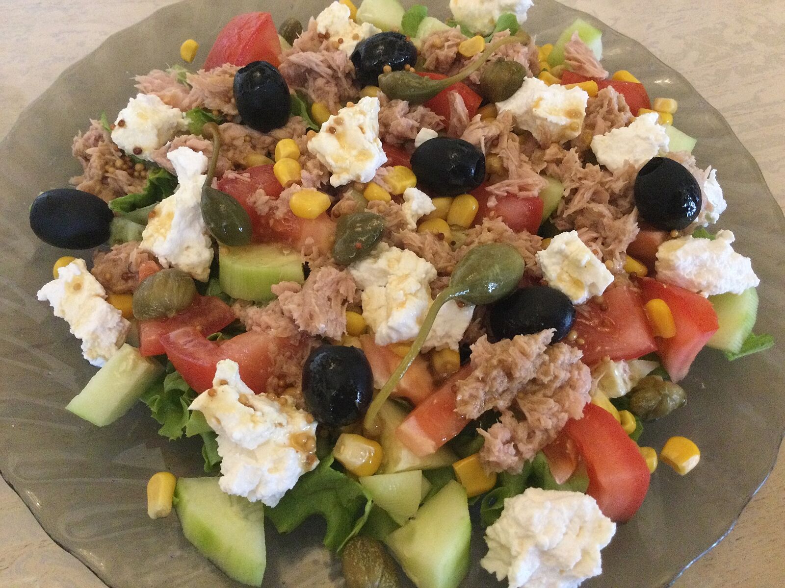 Кукурузная кашка а-ля ’банош’ с жаренным лучком + люля кебаб, салатик- лечо из баночки.