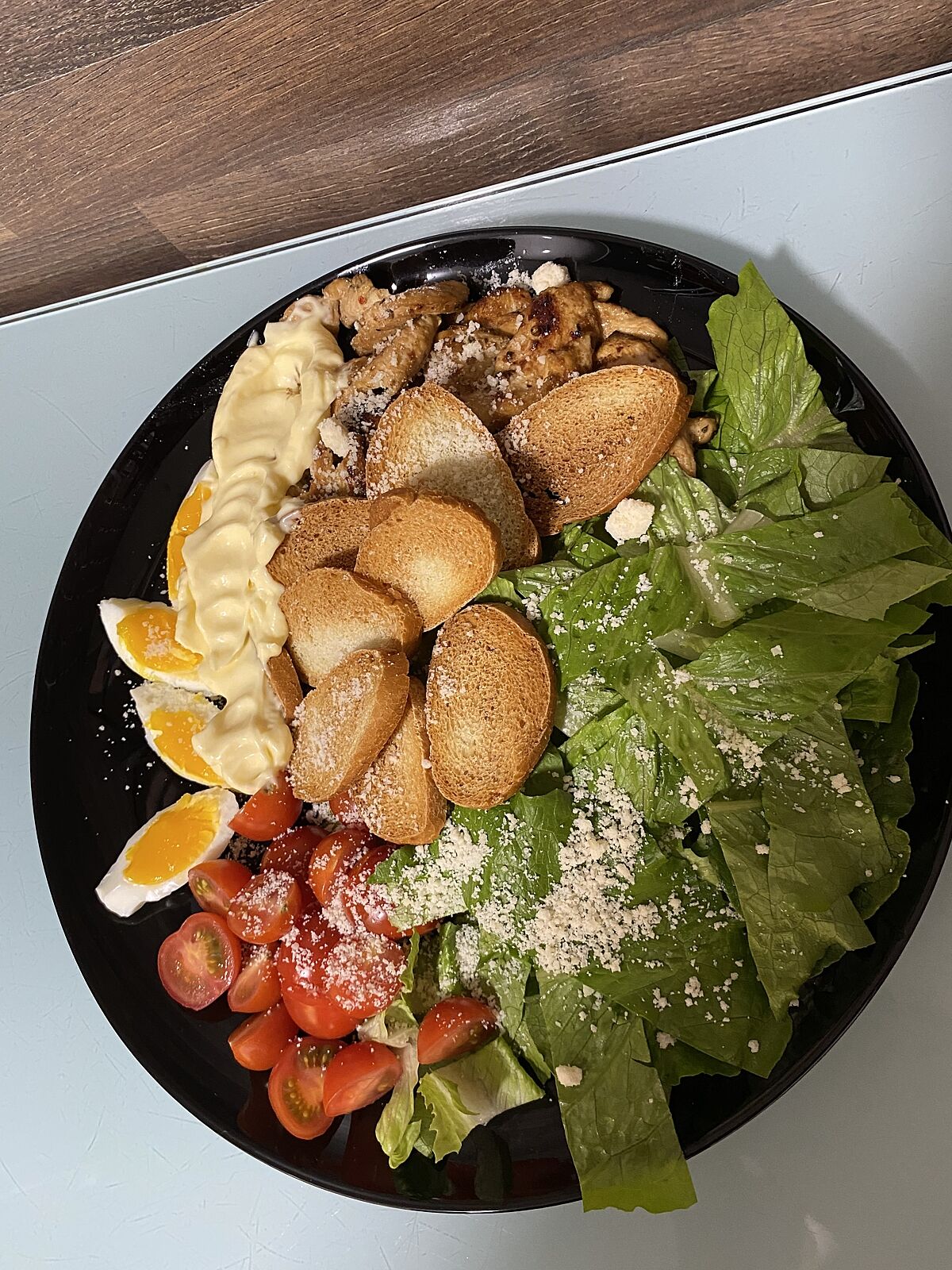 Варю яйця, ріжу чері-помідори, сплат айзберг, роблю соус ( трошки майонезу дитячого, часничку, італійські трави, солодкої гірчиці, води) в пряному соусі запікаю грудку. Все потім перемішую, заправляю соусом, пармезаном, додаю сухарики з духовки з часниковим маслом.