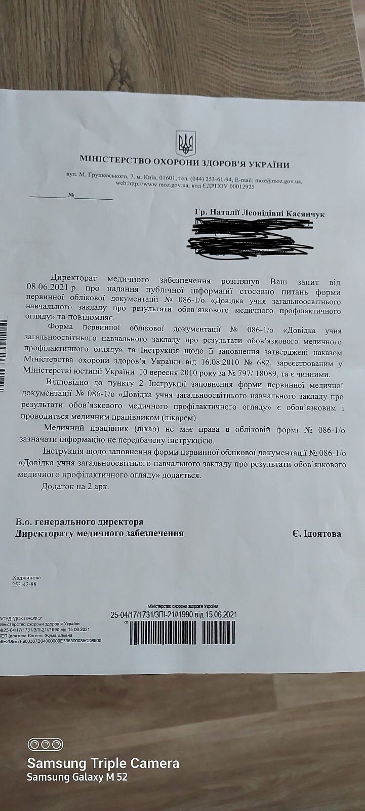 Довідка вже в школу 086 здана, та 063 також( там не вистачає 3 щеплень) і нам відмовили в прийомі в школу на денну чи дистанційну форму хіба на сімейну.