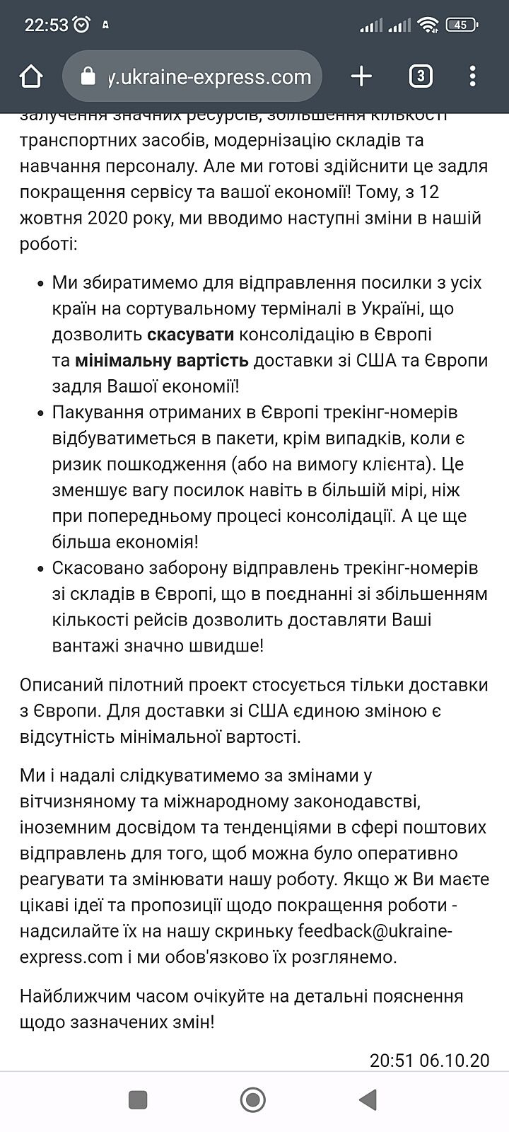 Сижу не знаю что делать, Новая Почта стала для меня очень дорогой. Мист как оказалось вообще жесть что творить начал с ценами и доп услугами чтоб не переживать за посылку (раньше через них заказывала). В этот раз решила попробовать Юкрейн Экспресс: два заказа вот получила сегодня, все супер кроме вмятин на коробке от обуви и то что оказывается они открывают посылки и переупаковывают в свои пакеты, платье с манго пришло просто в прозрачном пакете, без документа на возврат. Суть в чем. Жду очень дорогую куртку, магазин куртки присылает в коробках, трек номер магазин уже выдал, думаю переадресовывать на новую почту (но я не умею и еще не пробовала так делать) или молиться чтоб куртка доехала целой