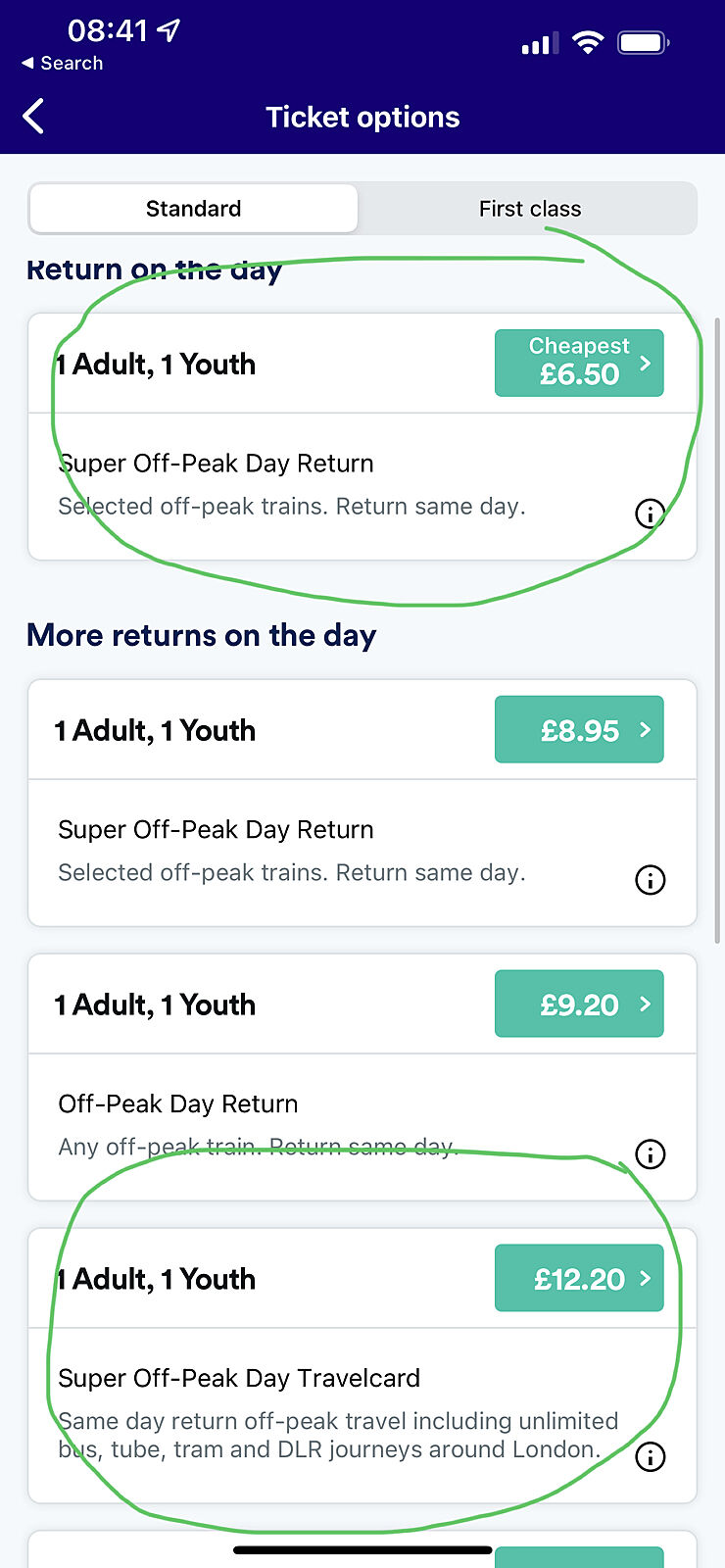 Вот, я покупаю билет через trainline, вот светится билет в Лондон на двоих туда-обратно, 6.5 фунтов туда-обратно это если просто до вокзала и обратно, 12.2 фунта это если туда-обратно на двоих + безлимитный общественный транспорт в этот день. Называется day travelcard