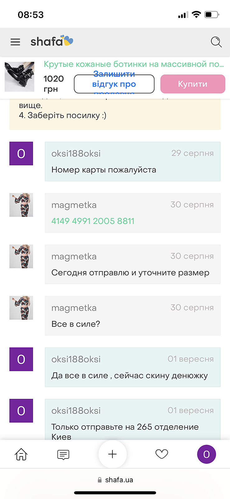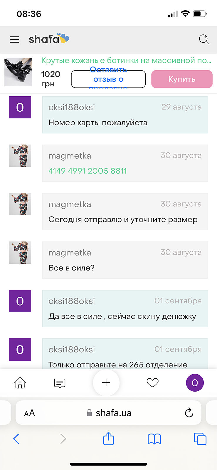 Заказывала ботинки , оплатила ,кормит завтраками , что отправит , в итоге , ничего никто не отправил , смс игнорируются . Будьте бдительны , так как аккаунт давно на шафе , последнее сообщение о простое вернуть средства на номер карты , ответ «в смысле»…