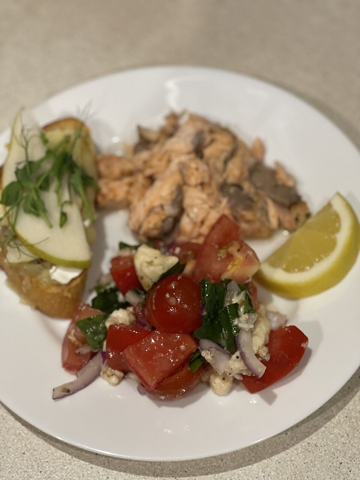 Фотку не сделала,не нужна была...а были брускеты из черного хлеба с разными орехами(подсушила и натерла зубчиком чеснока), поджарила на гриле слайсы баклажана,перца,цукини и лука ,выложила на хлеб и полила оливковым маслом...с бокалом красного вино ужинала.
