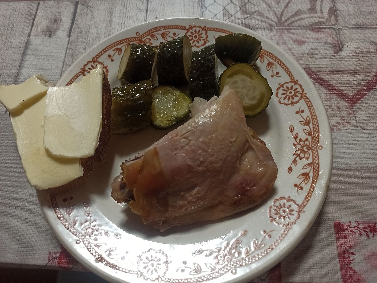 Прибежала с работы, бегом схватила что есть- курица, малосольные огурец, хлеб с маслом и надо ещё работу по дому сделать, спешу