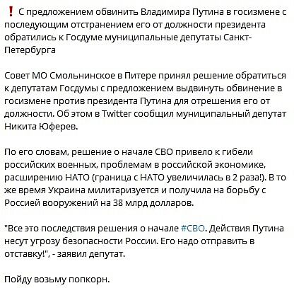 депутаты питера просят снять кабаева с должности за убийство десятки тысяч Емель в спецаперации.особо за задвухстотенных лаптей 2003 года рождения.практически детей кабаев отправил на убой и начался вой.ну питер всегда был колыбелью революций