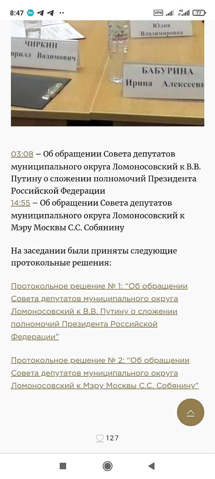 Так, 8 вересня Рада муніципального освіти Смольнінське у Санкт-Петербурзі запропонував Держдумі звинуватити президента Росії Володимира Путіна у державній зраді для усунення його з посади.