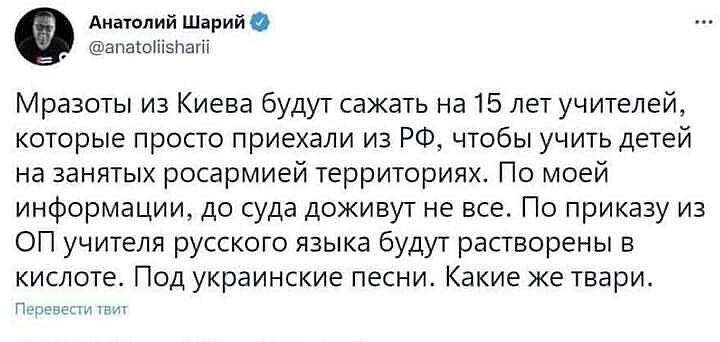 «Это фейк, что были учителя из РФ. Все, кто находился на территории Харьковской области, директора школ, учителя, которые изъявили желание покинуть Харьковскую область, они имели такую возможность. Мы это обеспечили, сегодня они находятся в Белгородской, Ростовской [областях], Краснодарском крае», — сказал министр.